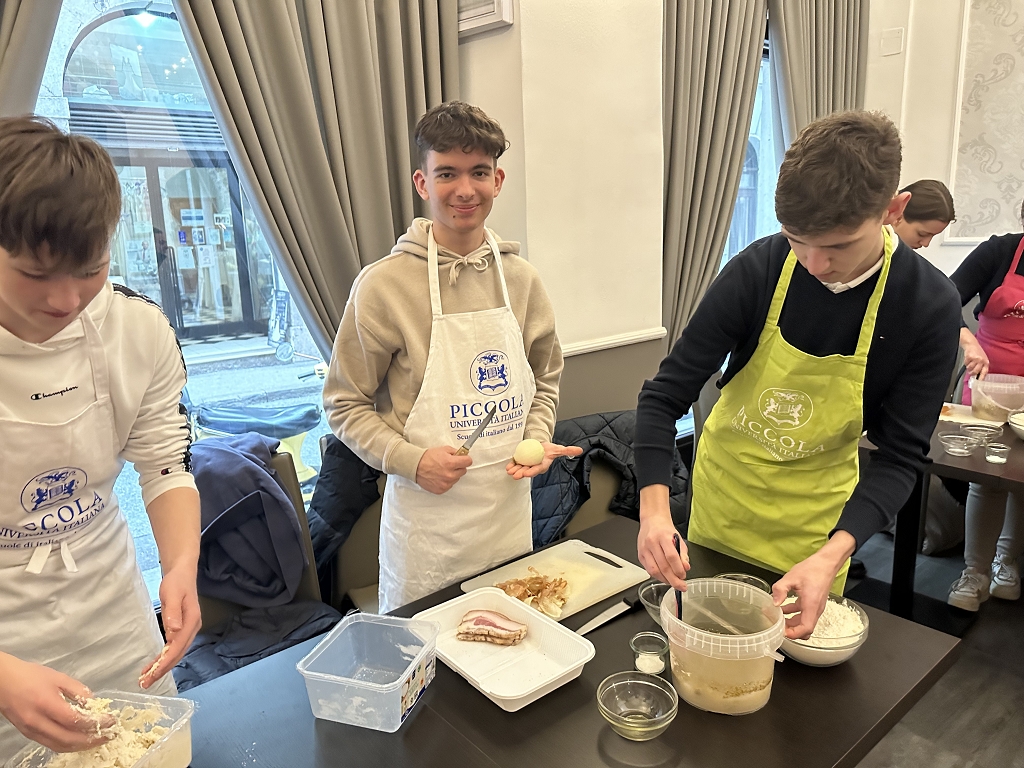Jeden Vormittag von 9 bis 13 Uhr absolvierten wir vier Stunden eines durchstrukturierten Programmes, durch das uns zwei extrem nette „Italiane vere“ namens Virginia und Serena führten. Sie bescherten uns Grammatik-, Lese- und Hörübungen, wodurch unsere Sprachkenntnisse enorm verbessert wurden. Eines der Highlights war definitiv das Sprechen mit den Einheimischen, denn wir hatten von unseren Lehrerinnen die Aufgabe bekommen, Personen auf der Straße höflich anzusprechen, uns vorzustellen und dann auf Italienisch zu interviewen. Ein zweiter Auftrag lautete, mit unseren Handykameras Motive festzuhalten, die typisch für Italien seien: Eine Vespa, ein Student mit Lorbeerkranz bis hin zu „Gelateria“ und „Kaffeehaus“ waren unter den landestypischen Details.