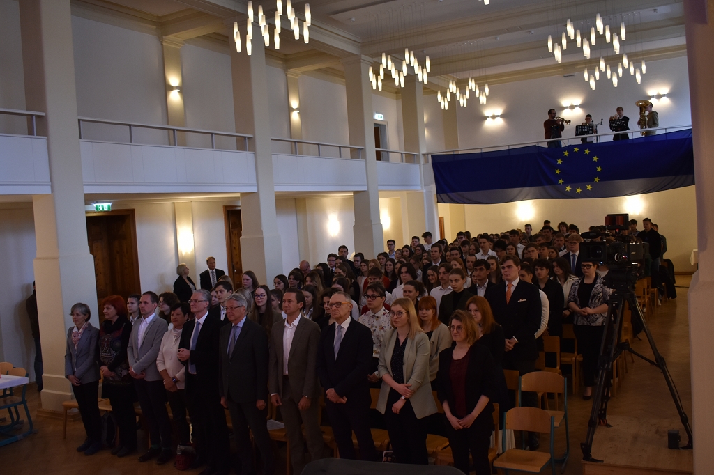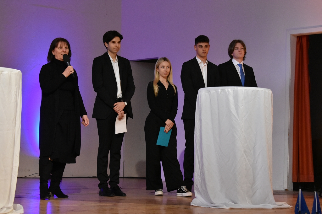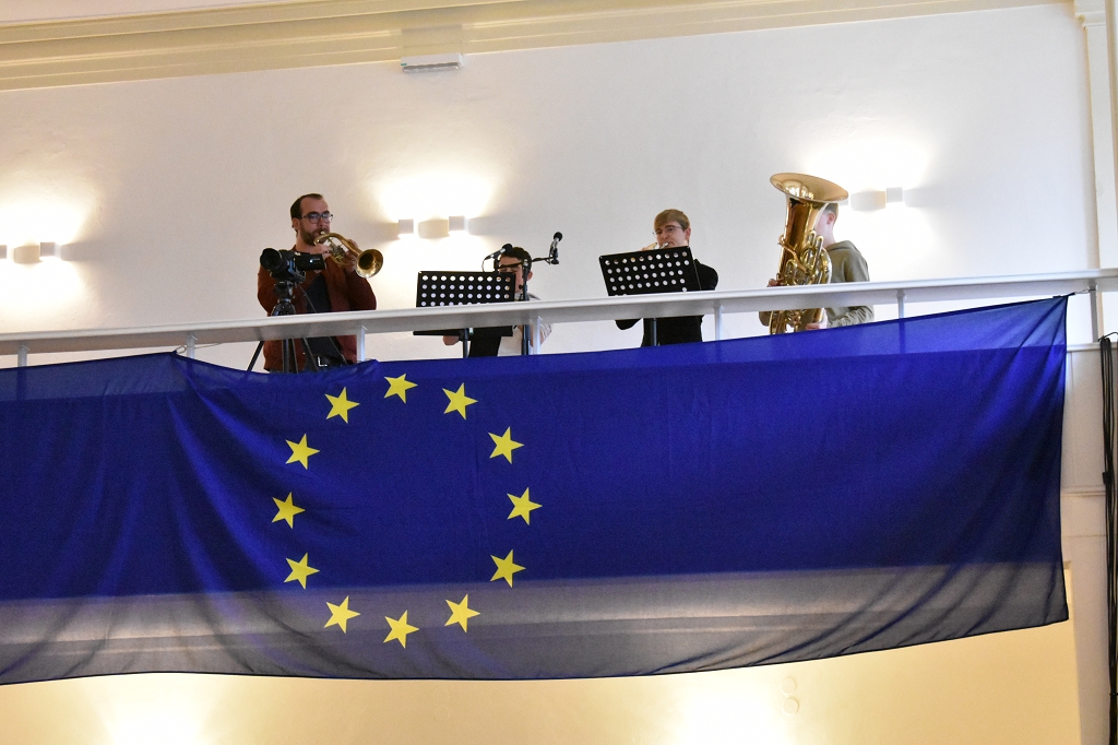 Musikalisch eröffnet wurde die Veranstaltung mit der Europahymne gespielt vom Bläserensemble (Prof. Thomas Zdravja, Tobias Steit (3c), Andreas Streit (6b) und Matthias Spendier (8c)) des Stiftgymnasiums.