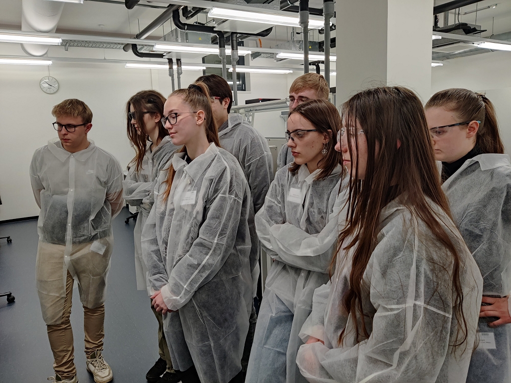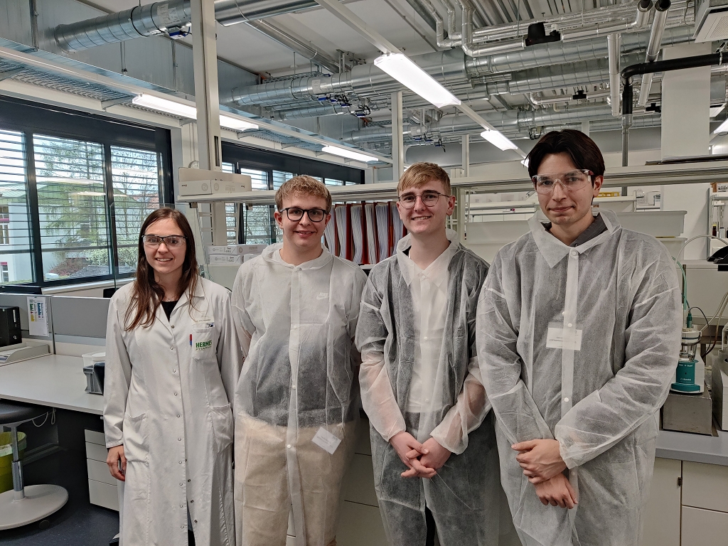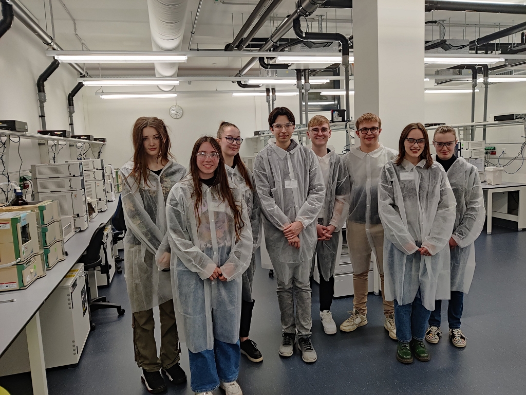 Ausgestattet mit Labormänteln und Schutzbrillen, wurden wir im Anschluss an die Präsentation durch die erst 2019/20 eröffneten Laborräume geführt. Im Zuge der Besichtigung konnten wir zahlreiche Geräte und Apparaturen bestaunen, von denen uns einige bereits aus den Lehrbüchern bekannt waren. So durften wir unter anderem verschiedene Chromatographen bewundern und konnten unser Wissen über die Funktionsweise dieser Analysegeräte auffrischen und vertiefen.