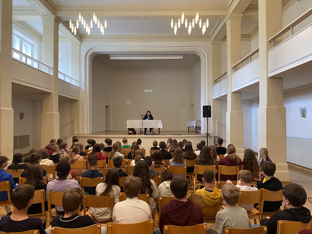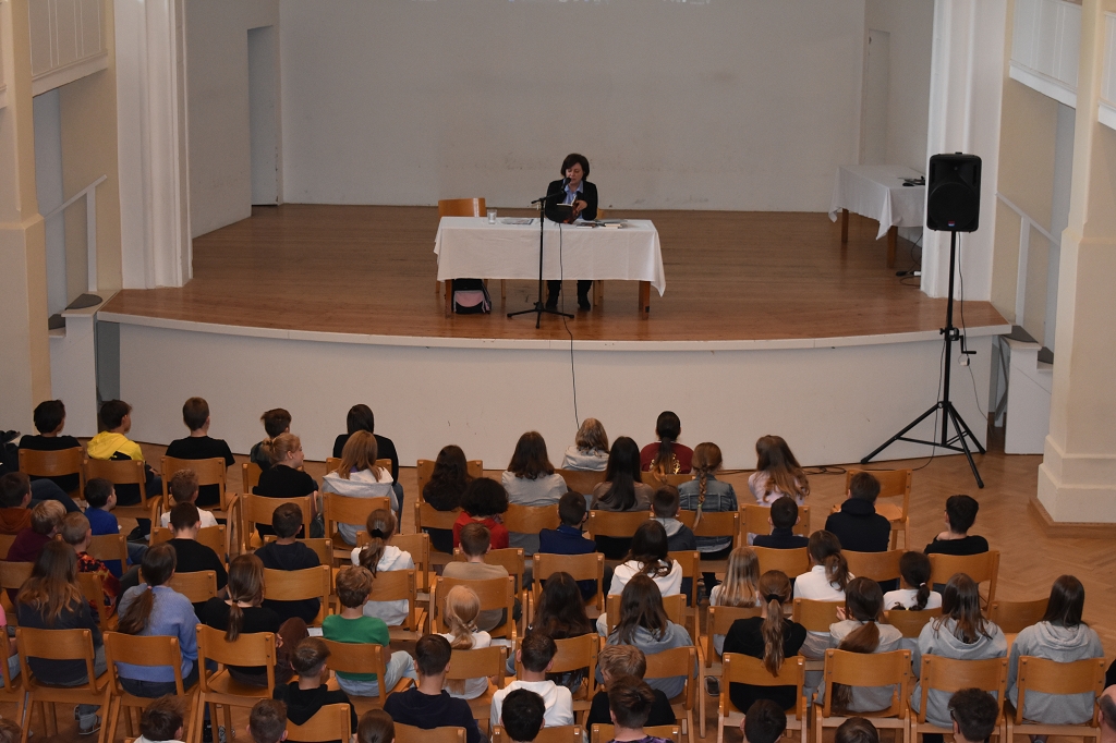 Einen Tag nach dem Lesebesuch von Christoph Klimke in der 3b ist die bekannte Lavanttaler Autorin Renate Zinterl aus St. Margarethen im Stiftsgymnasium zu Gast. Renate Zinterl hat als langjährige VS-Lehrerin und Mutter zweier Kinder viel pädagogische Erfahrung und zeigt keinerlei Berührungsängste.