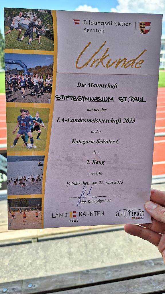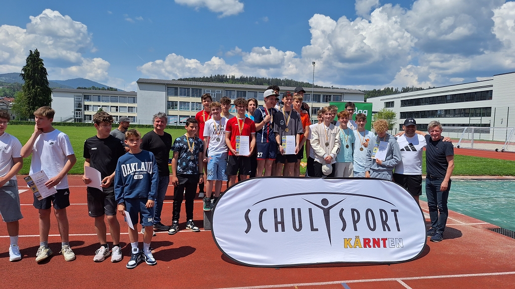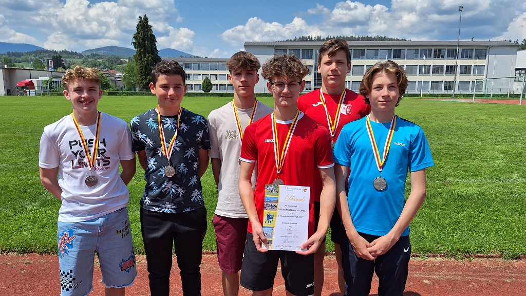 Georg Ellersdorfer (4C), Jakob Wuggenig (4D), Tobias Zoder (4B), Simeon Alisch (4B), Tobias Streit (3C) und Niklas Presser (3C) durften eine Woche später den Bezirk Wolfsberg bei den Landesmeisterschaften in Feldkirchen vertreten. Für den Landessieg reichte es zwar knapp nicht, die sechs jungen Athleten dürfen allerdings auf den ausgezeichneten zweiten Platz und die Silbermedaille sehr stolz sein.