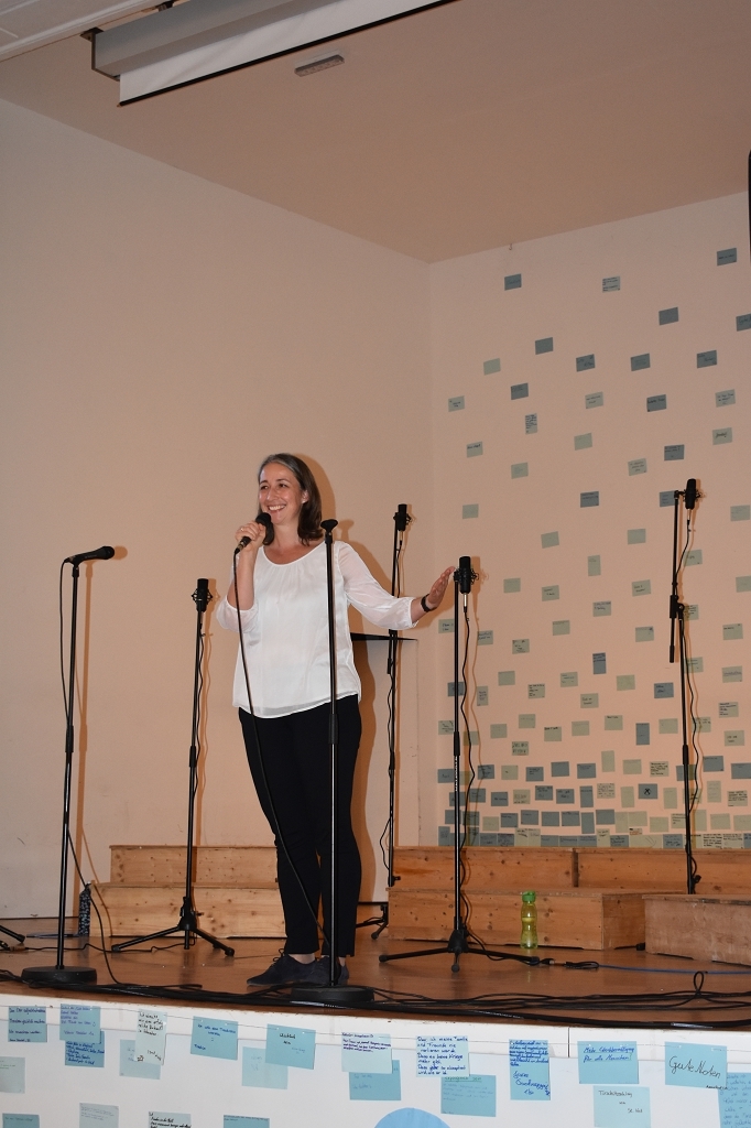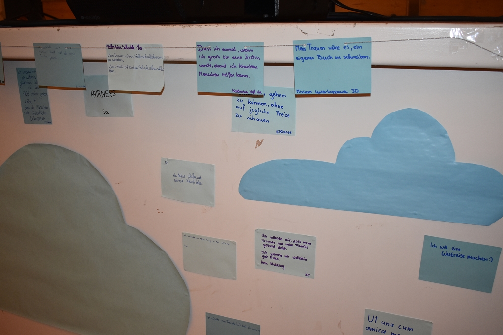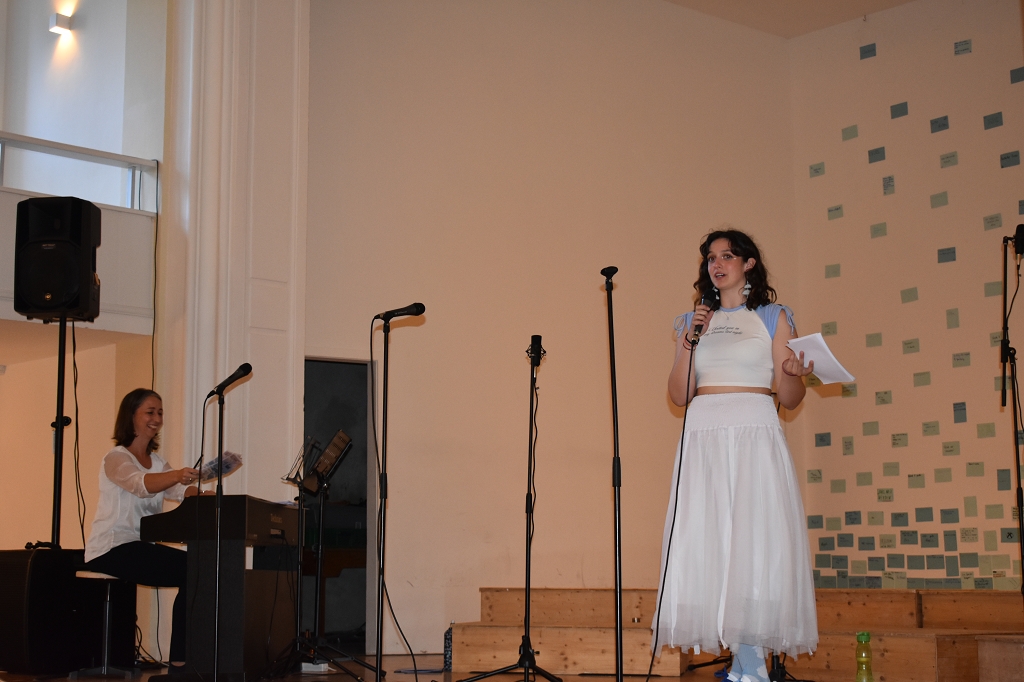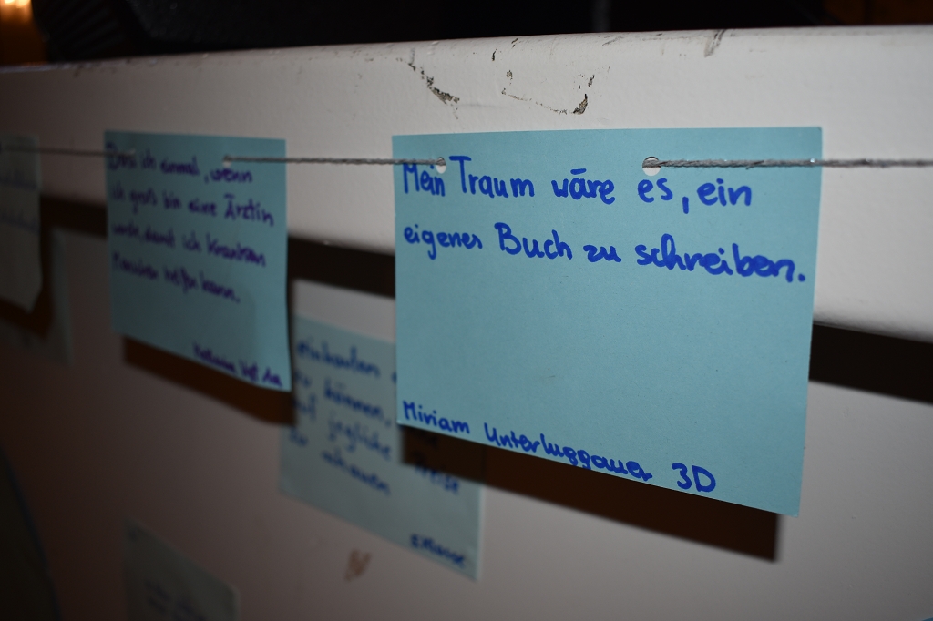 Durch das Programm führte Anna Henckel, Maturantin und Absolventin des Stiftsgymnasiums, die am Beginn des Konzerts jede/n einzelne/n Sänger/in mit Namen und ihrem/seinem größten Traum vorstellte. Auch die Dekoration des Festsaals mit blauen Kärtchen, auf denen jede/r Schüler/in des Stiftsgymnasiums seine/ihre Träume notieren durfte, war von Anna organisiert und durchgeführt worden.