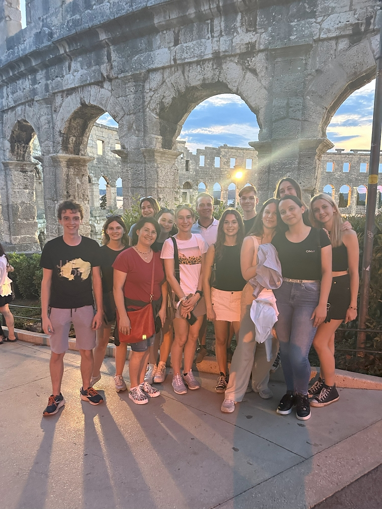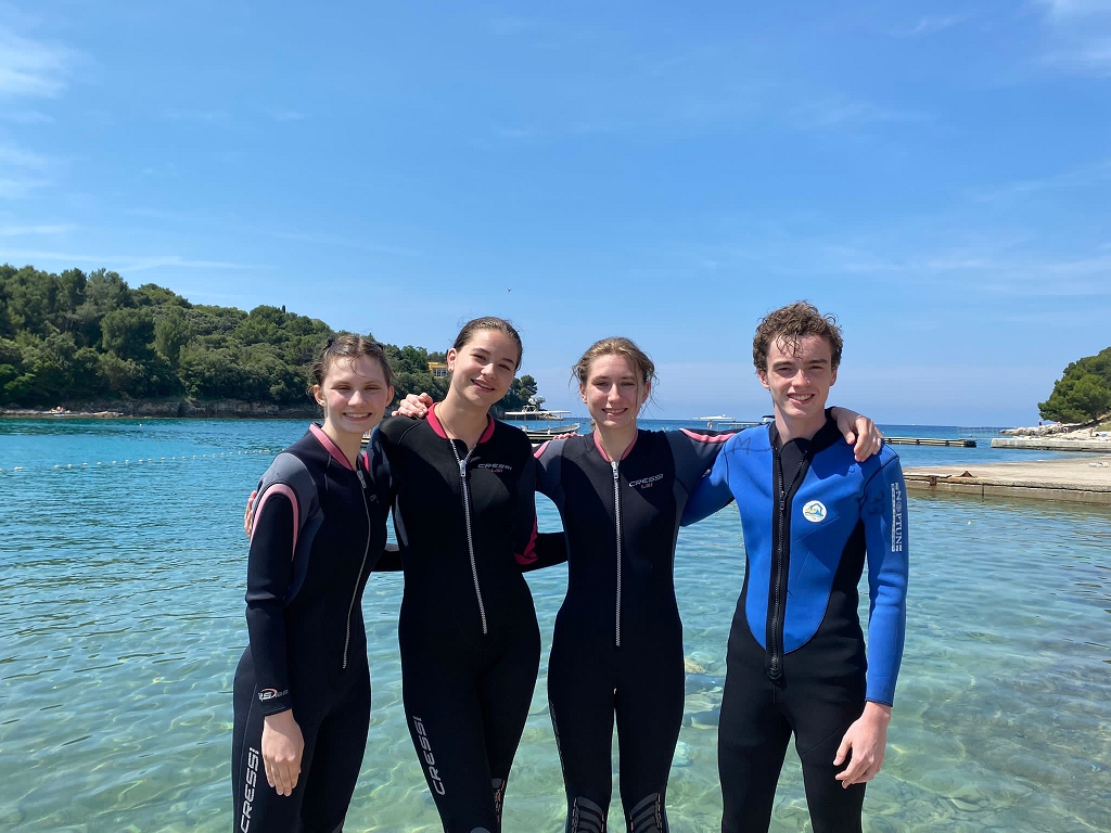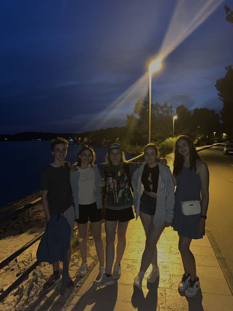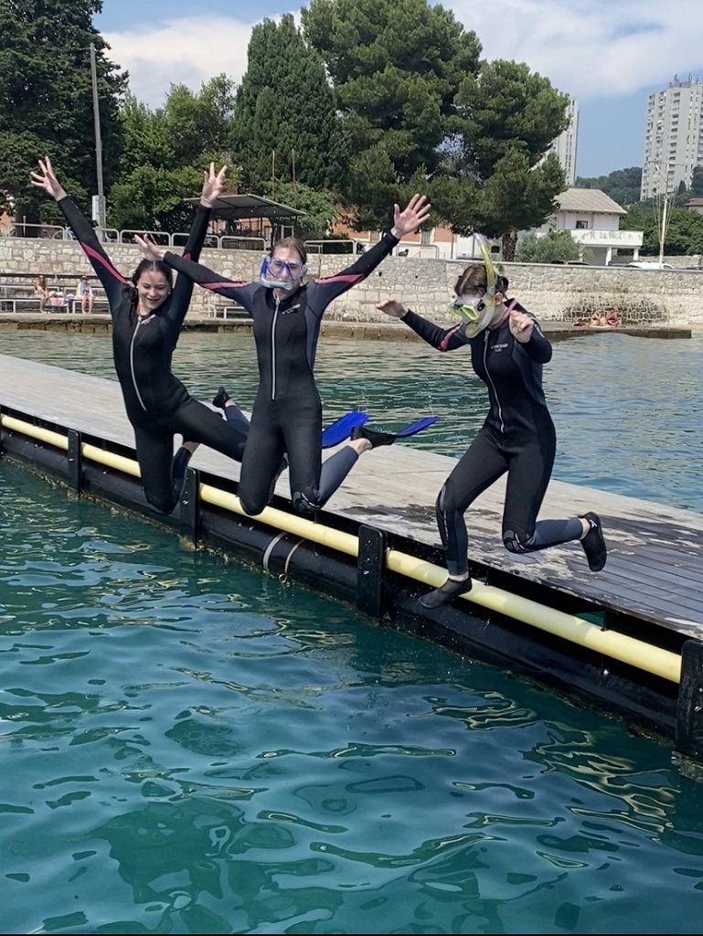 Hellwach ging die Reise am Freitag um sieben Uhr morgens los. Wir fuhren mit dem Bus fünf Stunden bis zu unserer Unterkunft, dem nah am Meer gelegenen Hotel Pula. Nachdem wir eingecheckt und die Zimmer bezogen hatten, machten wir uns direkt auf den Weg zur Meeresschule. Dort angekommen begrüßten uns herzlichst unsere Kursleiter Daniel und Mona. Um einen Sprung ins „kalte Wasser“ zu vermeiden, gaben sie uns zuerst eine theoretische Einführung in das Thema Meeresbiologie und Schnorcheln sowie die warmhaltenden und äußerst charmanten Neoprenanzüge. Danach ging es sofort ins Meer und wir durften uns beim Schnorcheln beweisen. Um den Hunger, der durch das Schnorcheln entstanden ist, zu stillen, machten wir uns wieder auf den Weg in unser Hotel und aßen dort zu Abend. Der erste Tag wurde mit einem romantischen Spaziergang durch die Stadt mit Eis und Getränken beendet.