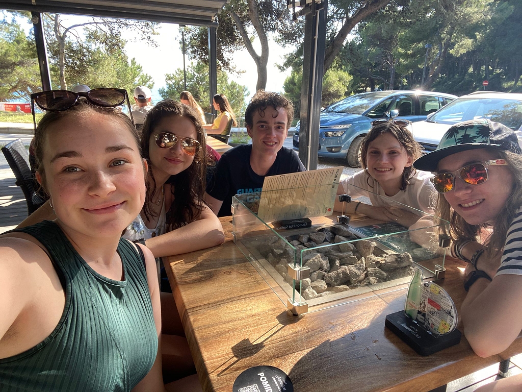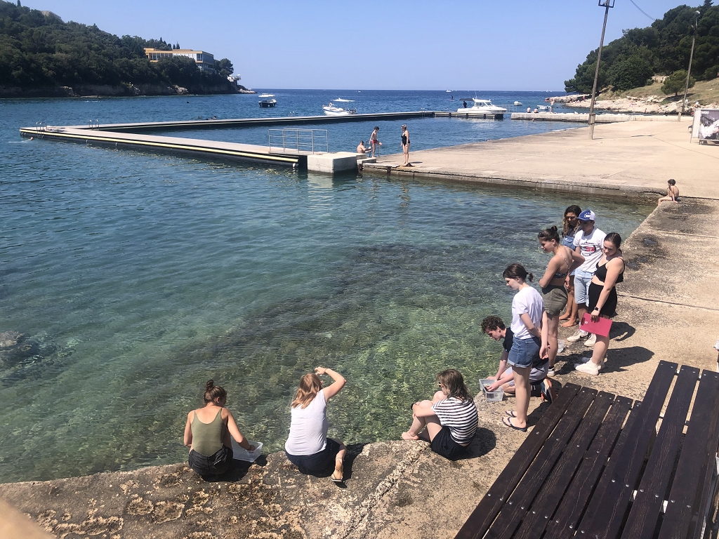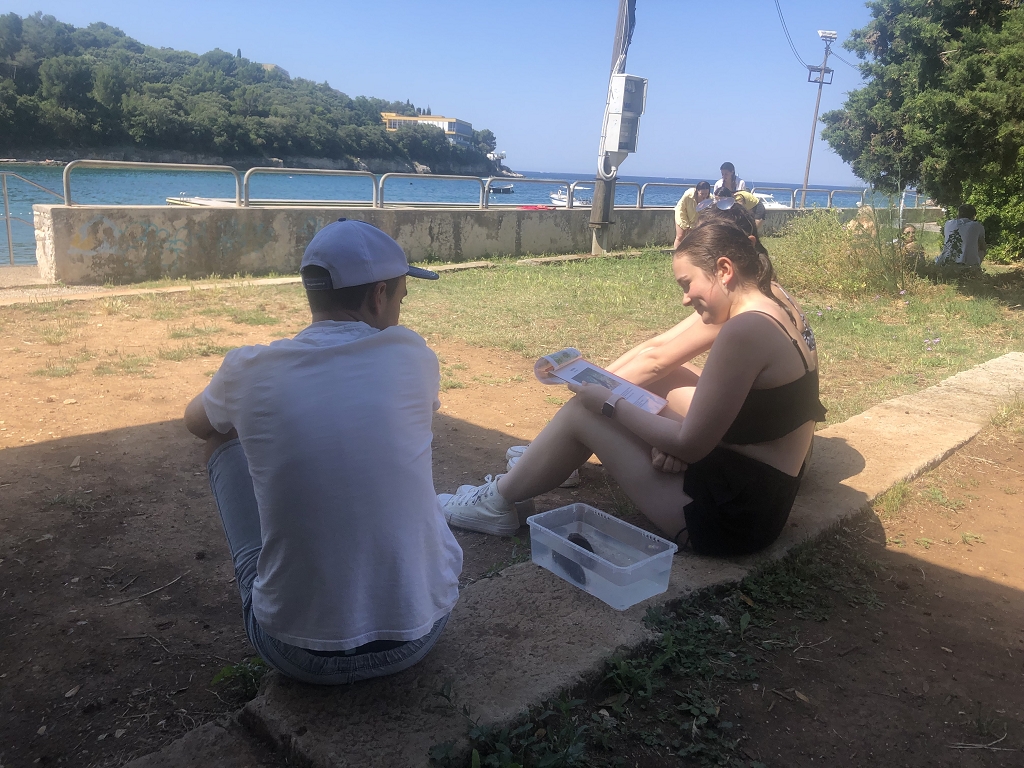 Leicht erschöpft von den hohen Temperaturen begann der dritte Tag mit einem Küstenprogramm, das etwas entfernt von der Meeresschule stattfand. Bei diesem mussten wir nach Tieren der Küste suchen und diese anschließend den anderen vorstellen. Zur Abkühlung sind wir ins Wasser gesprungen und zur Meeresschule zurückgeschwommen. Nachdem wir zu Mittag eine Stärkung eingenommen hatten, konnten wir den restlichen Nachmittag unsere Freizeit genießen. Natürlich verbrachten wir sie alle am Strand, Bräunungs- und Schwimmeinheiten dürfen bei einer Exkursion in Kroatien ja nicht fehlen. Dort wurden wir von einem unerwarteten „Star“, wie es uns Herr Prof. Riedner am Vorabend angekündigt hat, fröhlich überrascht, denn Herr Prof. Striednig besuchte uns.