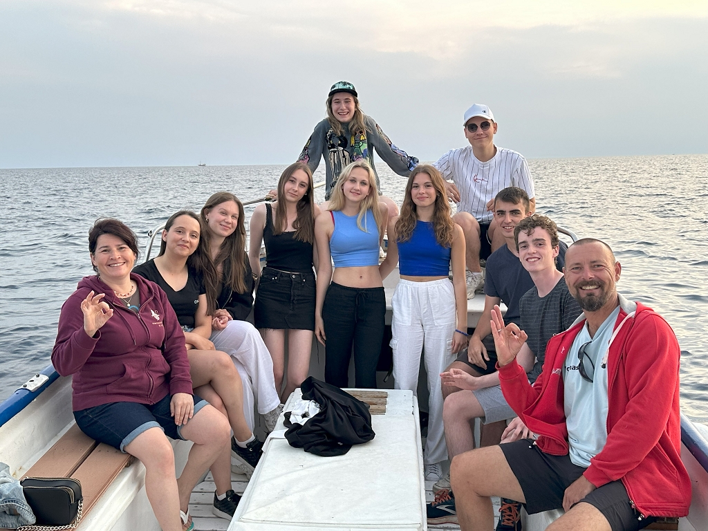 Frisch und fröhlich bewältigten wir nach dem Frühstück unsere zweite Einheit, in der es um bekannte Lebewesen im Meer ging. Jeden Tag sowie auch an diesem hatten wir eine Mittagspause, in der wir uns stärkten und ein wenig ausruhen konnten. Am Nachmittag folgte das erste Highlight unserer Exkursion: die erste Bootsfahrt mit einer Schnorcheleinheit bei der Posidonia Wiese.