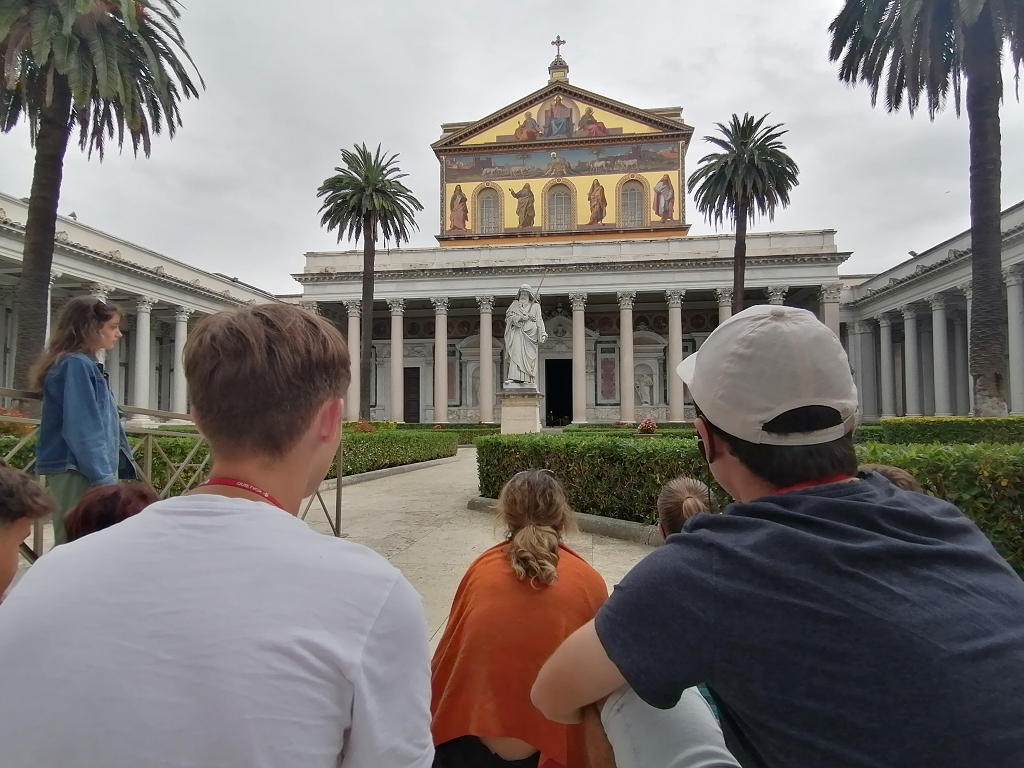 Am fünften Tag in der “Ewigen Stadt” machten wir uns auf den Weg, um früh genug am Petersplatz zu sein, wo wir die Ehre hatten, uns eine Papstaudienz ansehen zu dürfen. Das Stiftsgymnasium wurde aufgerufen, leider konnten wir unsere mitgebrachte Flagge aber nicht in die Kamera halten, da wir noch in der Schlange für die Sicherheitskontrolle standen. Nach einer Mittagspause machten wir uns mit dem Bus auf den Weg zu den San Sebastiano-Katakomben, wo wir durch eine interessante Führung wieder viel Neues lernten. Die letzte Sehenswürdigkeit des Tages, bevor wir unser Abendprogramm wieder selbst gestalten durften, war die Papstbasilika St. Paul vor den Mauern, wo wir wieder durch ein Referat neue Informationen dazulernten und die Porträts aller bisherigen Päpste betrachten konnten.