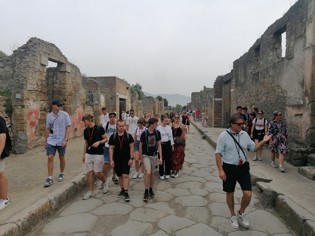 Am Dienstag stiegen wir zeitig in den Reisebus, um unseren kurzen Ausflug nach Pompeji zu beginnen. Nach einer kurzweiligen Fahrt mit einem Referat im Bus waren wir endlich angekommen und in der Anlage begrüßten wir einen neuen Reiseführer. Er zeigte uns die Überreste der vom Vesuv zerstörten Stadt. Man kann dort noch die Abgüsse der Opfer sehen und den Grundriss der ganzen Stadt gut erkennen, was es leicht macht sich das antike Leben dort vorzustellen. Nach der Führung und einer schnellen Stärkung in einem Restaurant ging es für uns im Bus weiter, aber nicht direkt nach Rom zurück. Nach einem Referat während der Busfahrt über den Heiligen Benedikt legten wir einen Zwischenstopp ein, und zwar bei der Benediktinerabtei Montecassino. Dort angekommen mussten wir uns natürlich sofort die Krypta des Heiligen Benedikts von Nursia anschauen, in der man die Wappen aller Benediktinerabteien an der Decke finden kann. Natürlich fanden wir das vom Stift St. Paul mit Leichtigkeit.