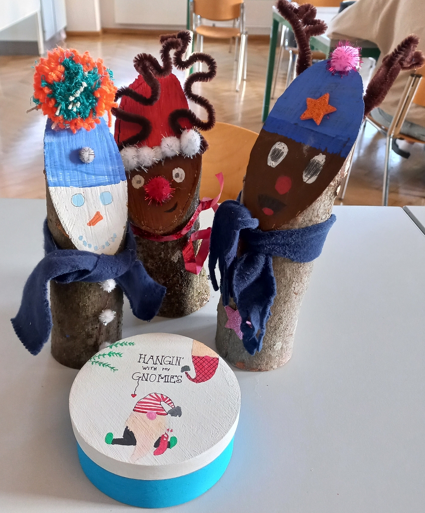 Die SchülerInnen zauberten aus alten Woll- und Stoffresten der Großmütter, Gurkengläsern oder Holzresten einzigartige neue Weihnachtsdekorationen, welche dann am 1. Elternsprechtag durch freiwillige Helferlein der 3. Klassen verkauft wurden. Sage und schreibe 400€ konnten dadurch für einen guten Zweck erzielt werden.