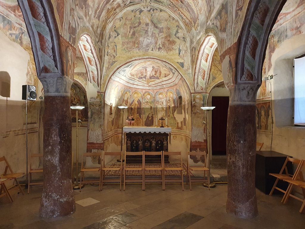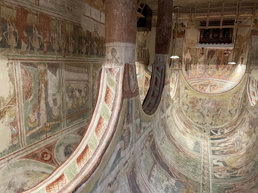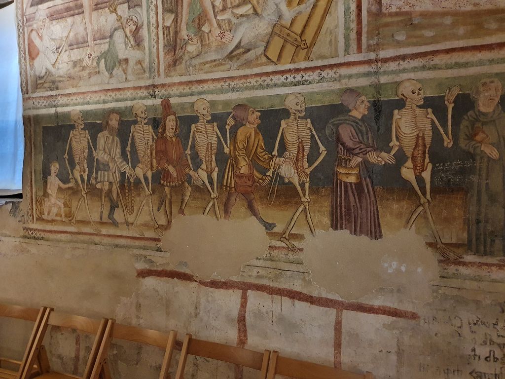 Im Bus hatte Kollegin Andrea Pötsch bereits ein bisschen über die bewegte Geschichte dieser im Hinterland der Küste von Slowenien gelegenen Kirche erzählt. Vor Ort wurden wir dann von der Kustodin der Kirche empfangen und über weitere Details informiert. Die Besonderheit dieser Kirche ist die auf den Innenwänden gemalte Bibelgeschichte. Höhepunkt dieser dargestellten Malerei ist der Totentanz (ähnlich wie wir diesen auch aus der Kirche von Mettnitz kennen).