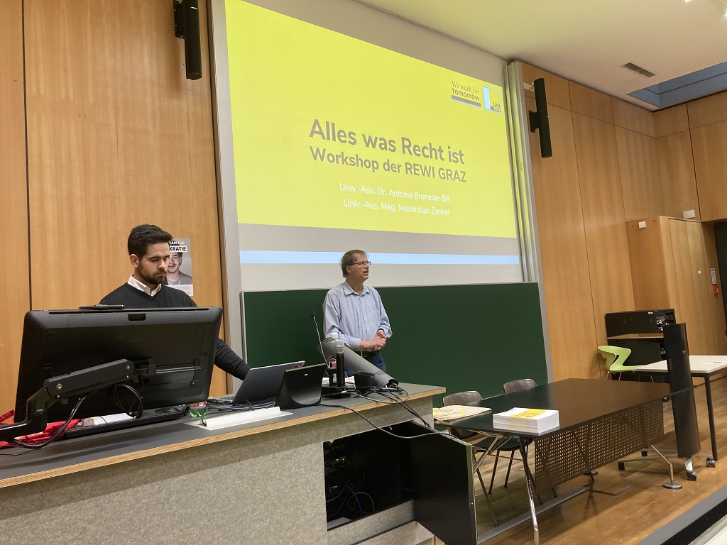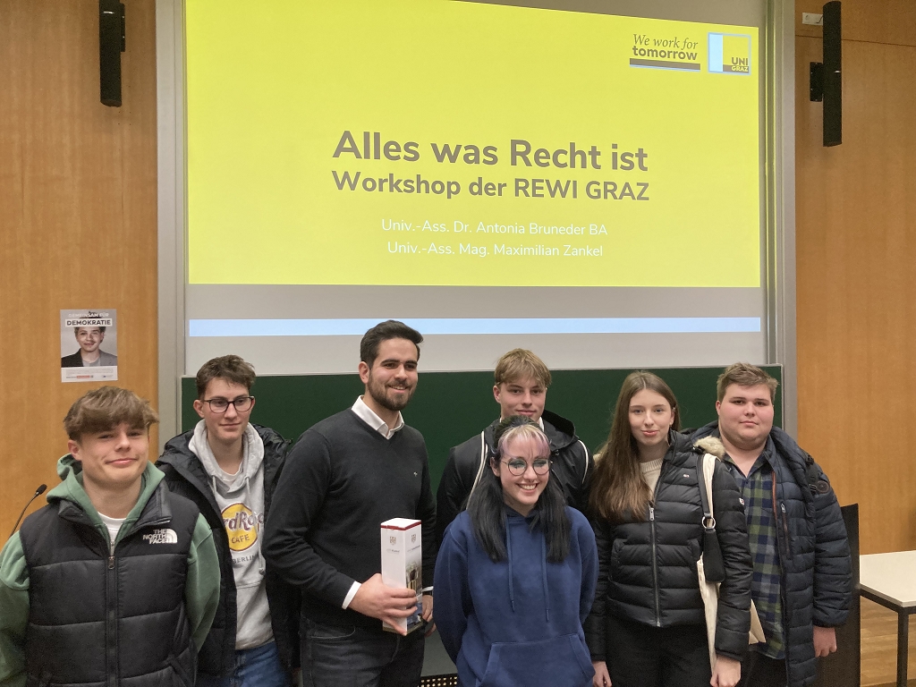 Spannend und perfekt umgesetzt war die Frage nach einem (weiblichen) Gottesbild am Institut für Altes Testament bei Univ.-Prof.in Katharina Pischny und ihrem Team. Die wissenschaftliche Betrachtungsweise und der unkonventionelle Zugang zu alttestamentlichen Texten mögen manche überrascht haben. Nach einer kleinen Mittagspause ging es weiter auf die REWI-Fakultät, wo es einen Einblick in das österreichische Rechtssystem gab. Dort gaben der Verfassungsspezialist Univ.-Prof. DDr. Dr. h.c. Bernd Wieser und Univ.-Ass. Mag. Max Zankl auf erfrischende Art und Weise eine kleine Einführung zum Diplomstudium der Rechtswissenschaften, aber auch zum Bachelorstudium Wirtschaftsrecht für technische Berufe. Nachdem die Dekanin Univ.-Prof.in Dr.in Gabriele Schmölzer, eine Kärtnerin, von unserem Besuch erfahren hatte, ließ sie es sich nicht nehmen, uns ebenfalls herzlich zu begrüßen. Auf jeden Fall war es ein spannender Tag in Graz mit vielen Perspektiven für die Zukunft.