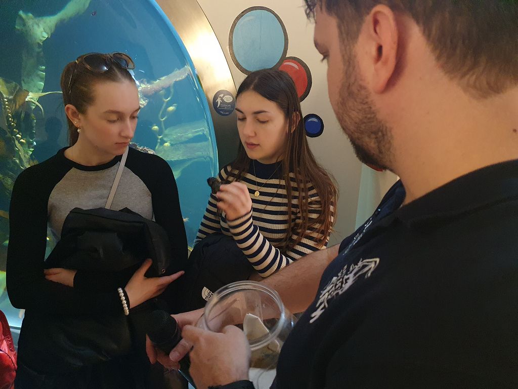 Am nächsten Morgen, nach dem Frühstück im Hotel, begaben wir uns zum Haus des Meeres, das über 10 Stockwerke, eine Aussichtsplattform und ein Dachrestaurant verfügt. Auch hier wurden wir von unserem Guide herzlich empfangen, der uns spannende Einblicke in die Welt der Knorpelfische gab. Zu diesen gehören Haie, Rochen und andere Arten. Wir bewunderten ein Haigebiss und verschiedene Haifischeier, bevor uns unser Guide durch die verschiedenen Stockwerke führte und uns die Besonderheiten verschiedener Meeresbewohner zeigte. Besonders fesselnd war die Lebensgeschichte der Meeresschildkröte Puppi, welche die berühmteste Bewohnerin des Hauses ist und das Haifischbecken fest im Griff hat. Unsere offizielle Führung endete bei den Mittelmeeraquarien, doch Herr Prof. Sapper führte uns noch durch den Aquarium-Tunnel und zum Hammerhaibecken. Danach hatten wir Zeit die anderen Stockwerke individuell zu erkunden, bevor wir die Aussichtsplattform besuchten, von der aus wir einen atemberaubenden Blick über Wien hatten.