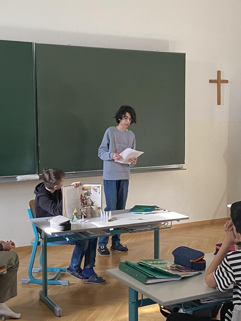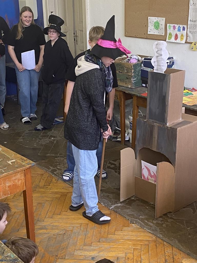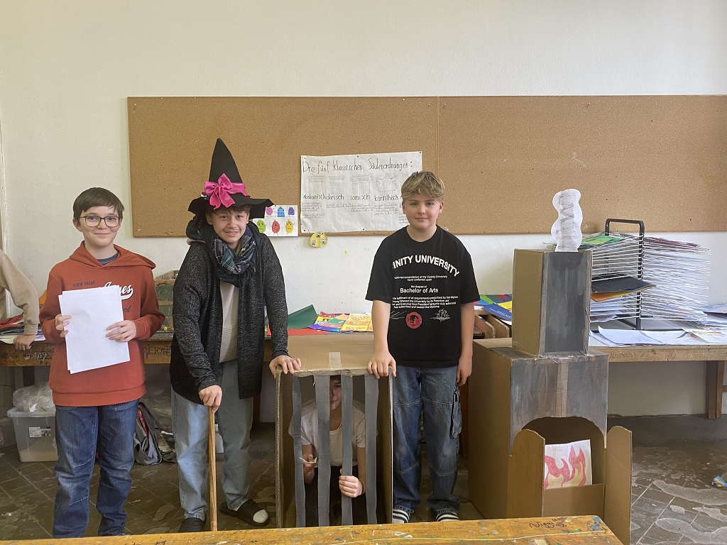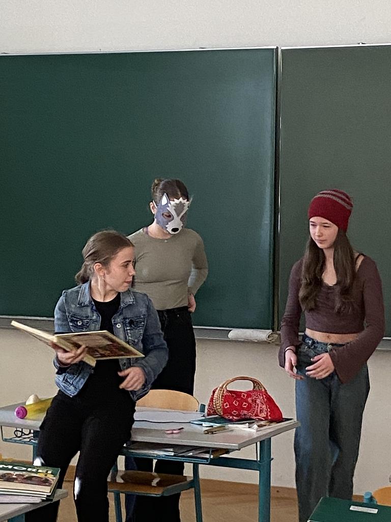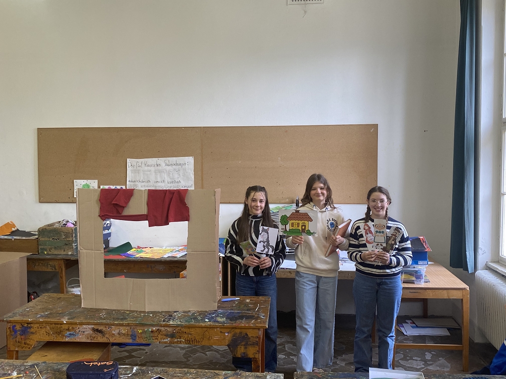 In der Unterstufe haben die Deutsch-Professor:innen der vierten und dritten Klassen individuelle Lesepakete für die Erst- und Zweitklassler zusammengestellt. Die dritten Klassen bereiteten für die ersten Klassen verschiedene Märchen vor. Es wurde aber nicht nur vorgelesen. Auch für das Auge war etwas dabei, denn die Schüler:innen integrierten das Vorlesen in Theaterstücke. Verschiedene Requisten und Kostüme wurden gebastelt und hergestellt. Eine Gruppe bereitete sogar ein Puppentheater für die Erstklässler vor. Mit viel Liebe zum Detail entstanden wunderbare Szenen, die die Schüler:innen der ersten Klassen begeisterten. Auch die „Großen“ hatten Freude daran, den Erstklässlern die Ergebnisse ihrer Arbeit zu präsentieren. Die vierten Klassen beschäftigen sich mit verschiedenen Balladen, die sie den Schüler:innen der zweiten Klassen näherbrachten. Einzelne Szenen wurden ebenso von den Viertklässlern nachgespielt, was das Verständnis des oft schwierigen Inhalts der Texte erleichtern sollte.