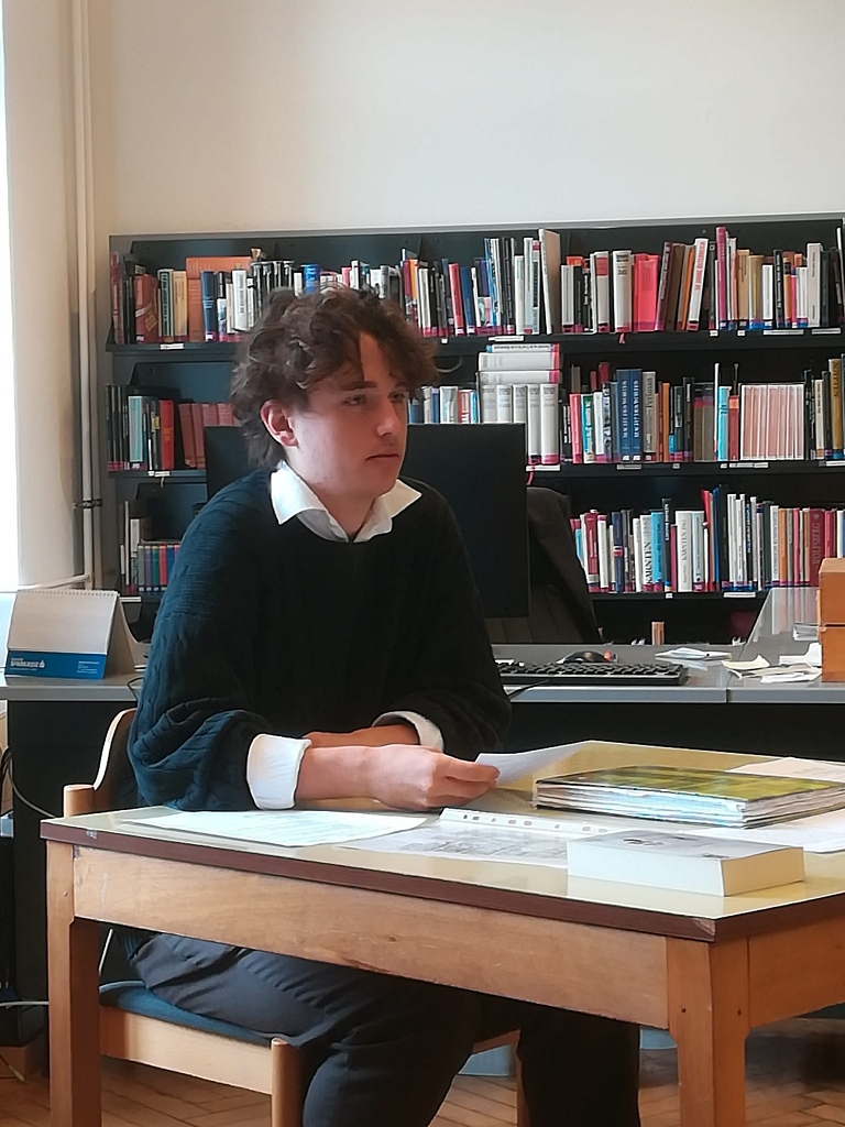 Zu den Lesungen der Oberstufe versammelten sich die Schüler klassenweise in der Bibliothek, wo von der ersten bis zur sechsten Stunde Hochbetrieb herrschte. Die Vor-Lesungen standen unter dem Thema „Literatur in und über Kärnten“. Zwei Vorleseteams versorgten das jeweilige Auditorium mit Kurztexten von Janko Messner und Egyd Gstättner, Schriftstellern, die vom Schulbibliothekar exemplarisch aus der Vielzahl möglicher Kandidat:innen ausgesucht worden waren. Den beiden Leseteams, bestehend aus Schülern der 8b, 7c und 6b, ist es gut gelungen, spezifische Themen und Stoffe der Kärntner Literatur zu transportieren. Die Besucher konnten sich auch an einer Ausstellung von bibliothekseigenen Büchern von Kärntner Autor:innen erfreuen, die die Buntheit und Vielfalt des literarischen Schaffens in Kärnten abbildet. Das ansprechende Poster dazu stammte von Sandra Dohr (8b).