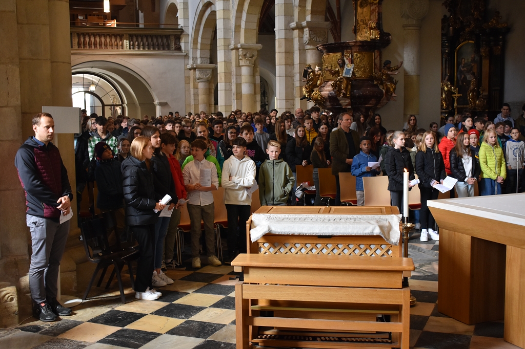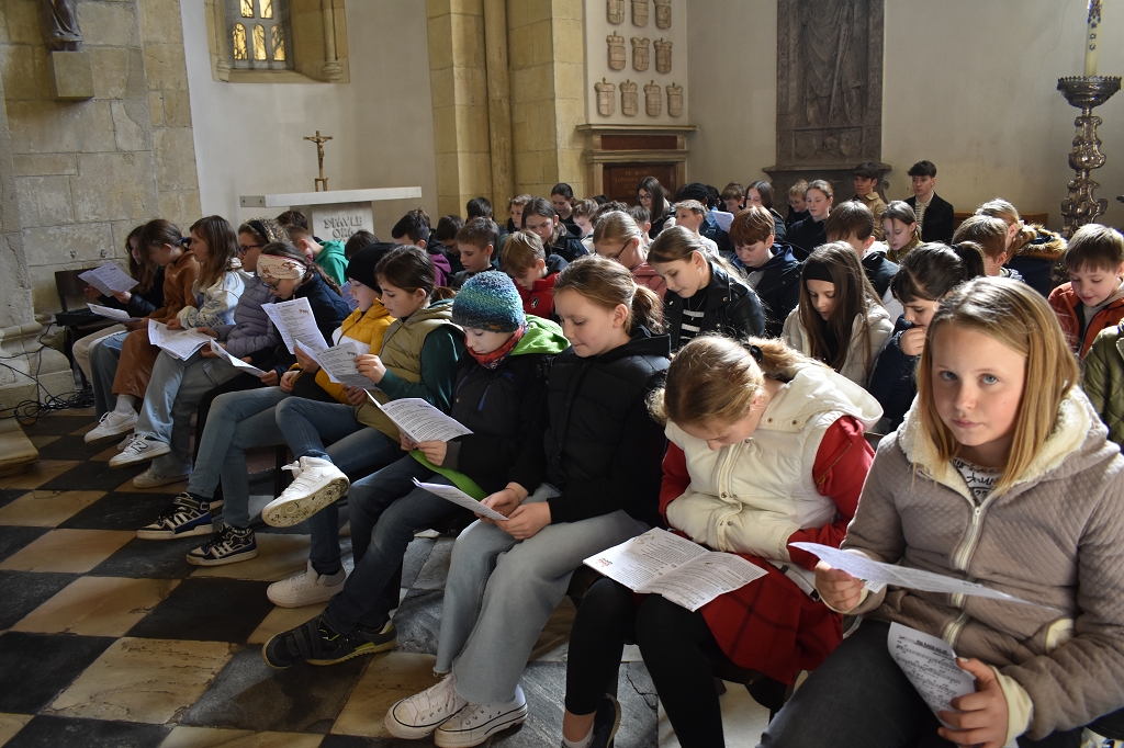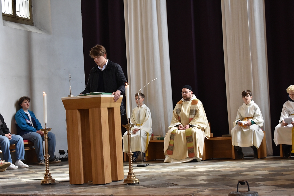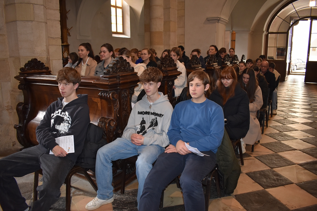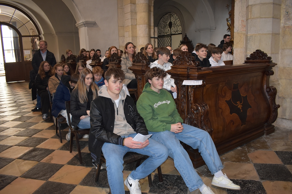 Auch dieses Jahr fand am 22.03.2024 die vorösterliche Messe vor dem Beginn der Osterferien statt. Zentrales Thema des Gottesdienstes war das Doppelgebot der Nächstenliebe (Mk 12, 29-31), welches sich als Leitgedanke durch die Fastenzeit gezogen hatte. Für die Feier der heiligen Messe danken wir Provisor Mag. Pater Marian Kollmann, der in einer lebhaften Predigt das Gebot der Nächstenliebe anschaulich erklärte und erläuterte, dass „Feinde“ zu lieben, auch heißen kann, seinen Nächsten nicht im nächsten Teich zu versenken – der Versuchung, den leichteren Weg zu gehen, zu widerstehen, da die Liebe es fordert, den Kelch zu nehmen, der einem von Gott gegeben wurde.