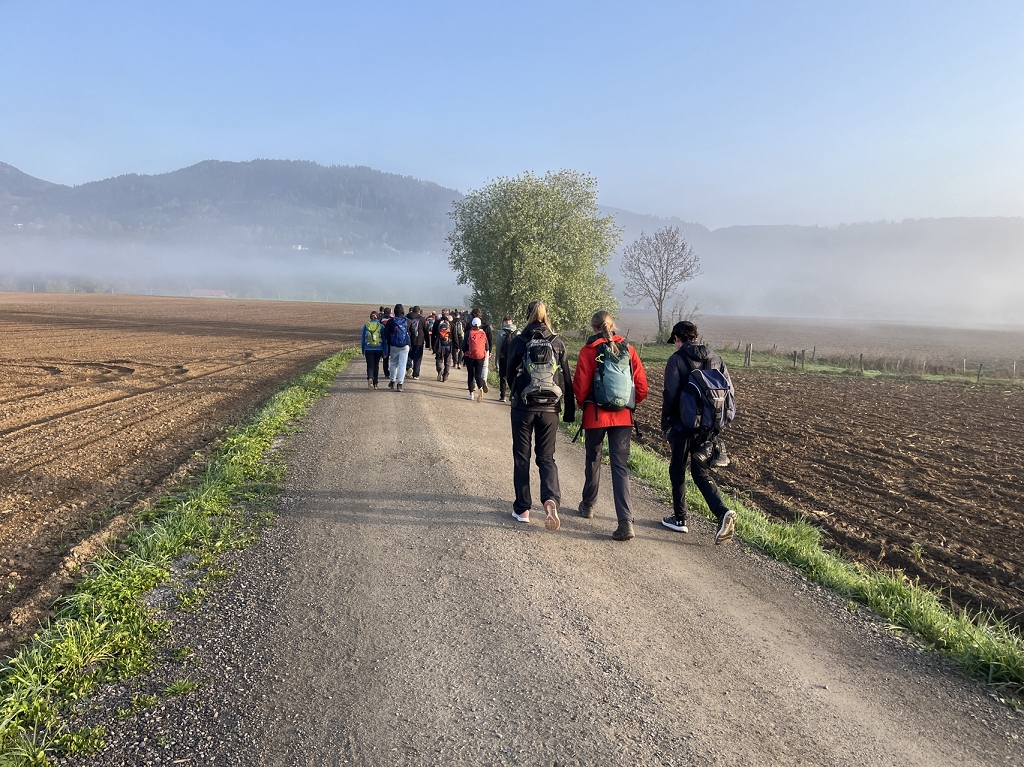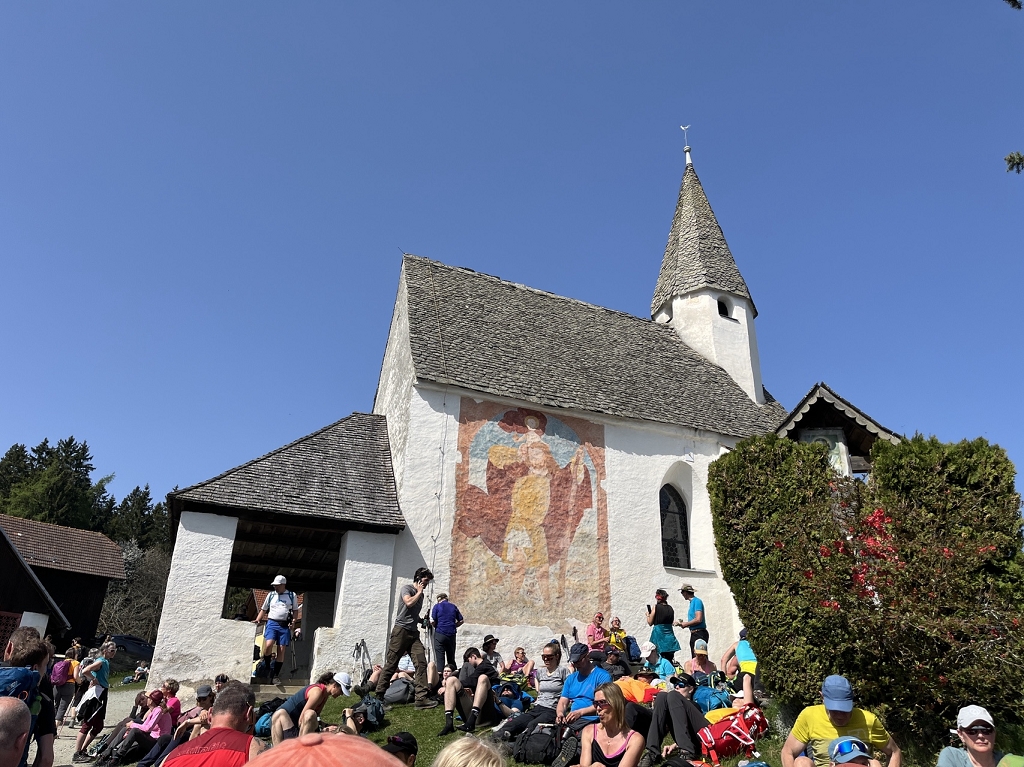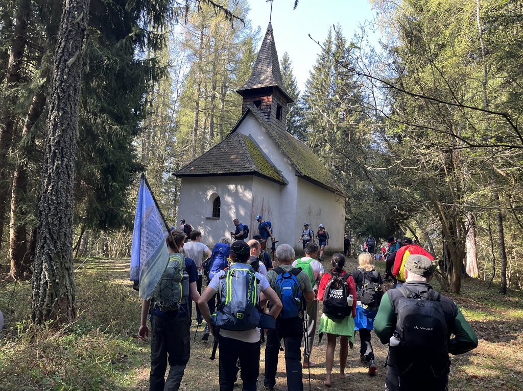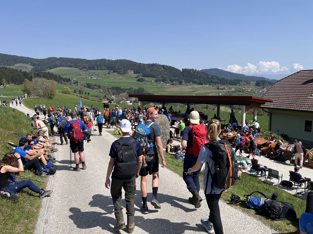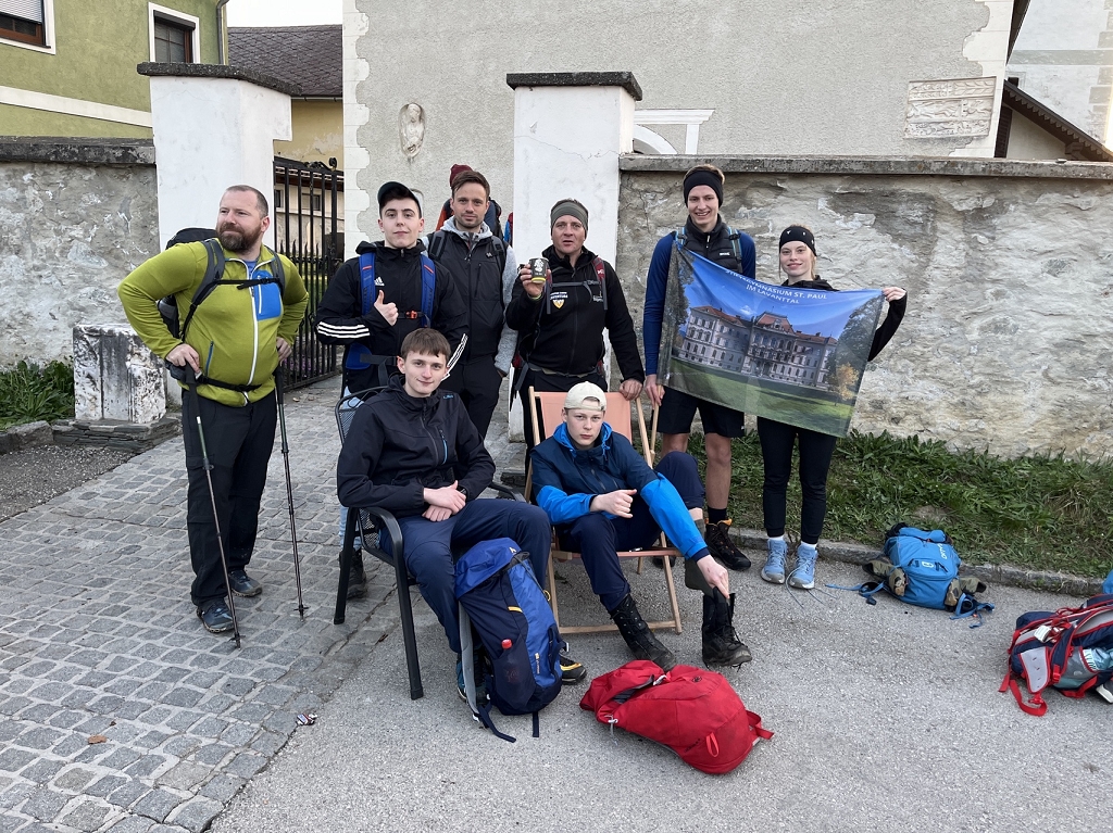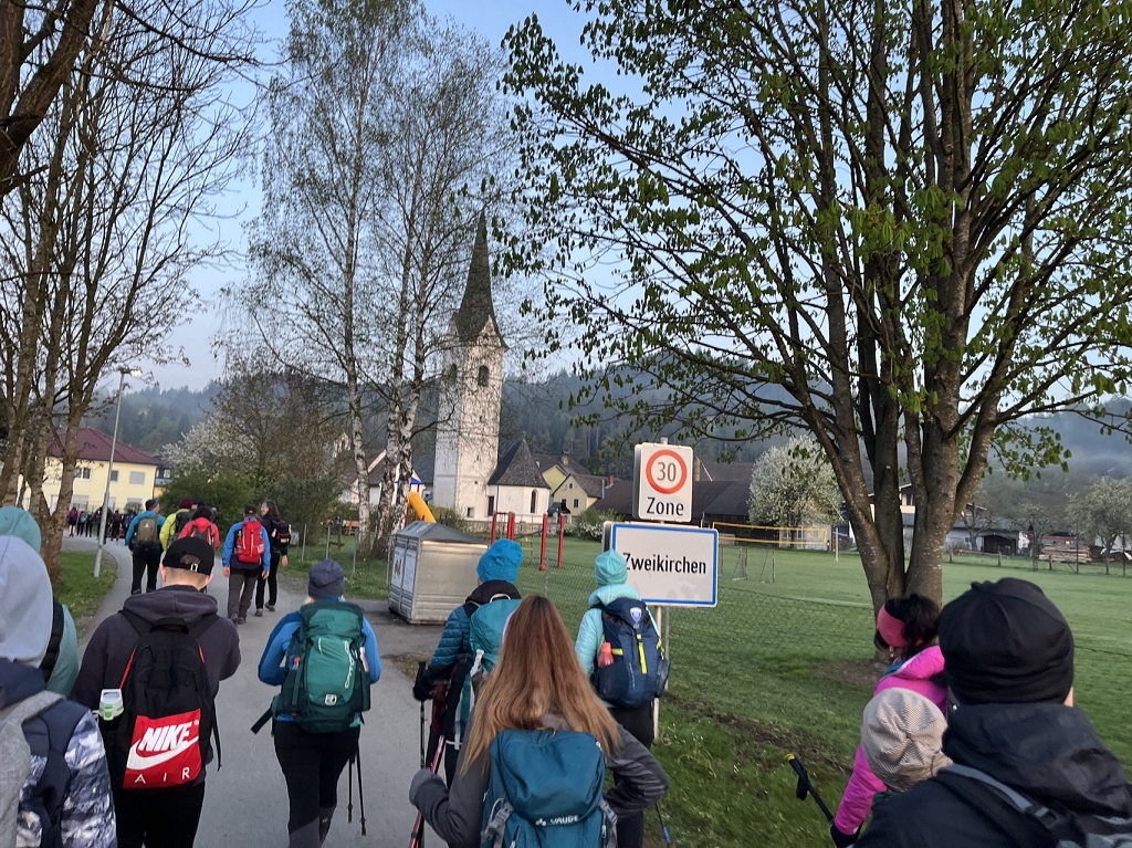 Am Donnerstag, dem 11.04., ging es mit dem Bus von St. Paul bis zum Magdalensberg, wo die Pilgergruppe um Mitternacht nach einem gemeinsamen Gebet startete. Schwer bepackt mit Proviant, Taschenlampen und der festen Entschlossenheit, diese Herausforderung anzunehmen, machten wir uns auf den Weg. Zuerst ging es vom Magdalensberg hinunter bis zu einem Gasthof, wo wir eine kurze Rast einlegten. Nach einer kurzen Stärkung ging es zum zweiten und steilsten Berg, dem Ulrichsberg. Umringt von unzähligen anderen Pilgern kämpften wir uns das steile Stück hoch und kamen erschöpft oben an. Dort legten wir eine wohlverdiente Pause ein. Nachdem also diese schwere Aufgabe bewältigt war, machte sich die Gruppe auf zum nächsten Berg, dem Veitsberg. Langsam wurde es heller, und die ersten Kinder standen schon am Wegesrand, um Süßigkeiten von den Wallfahrern zu empfangen. Übermüdet, aber mit dem Willen, auch noch die letzten zwei Berge zu erklimmen, setzten wir einen Schritt nach dem anderen. Langsam wurde es heiß und der Anstieg auf den Veitsberg zehrte an unseren Kräften. Nach einer Pause auf dem Hof des Bruders von Herrn Professor Maltschnig, wo wir hervorragend bewirtet wurden, ging es das letzte Stück auf den Lorenziberg hoch.
