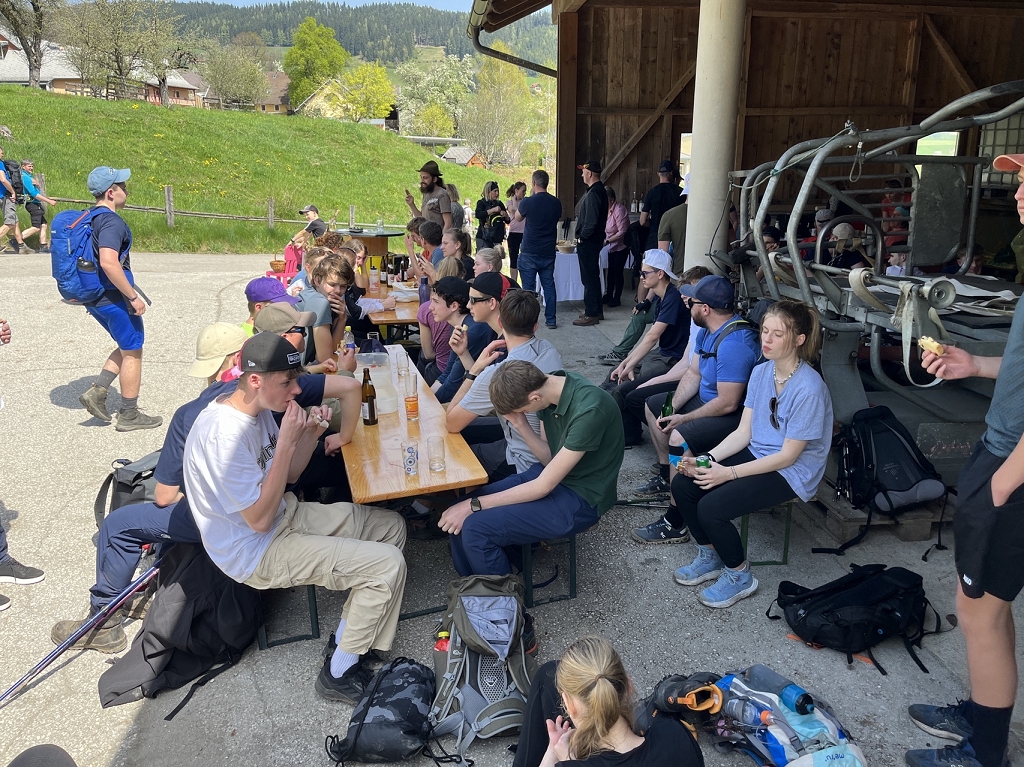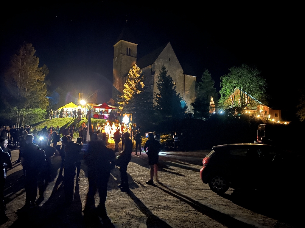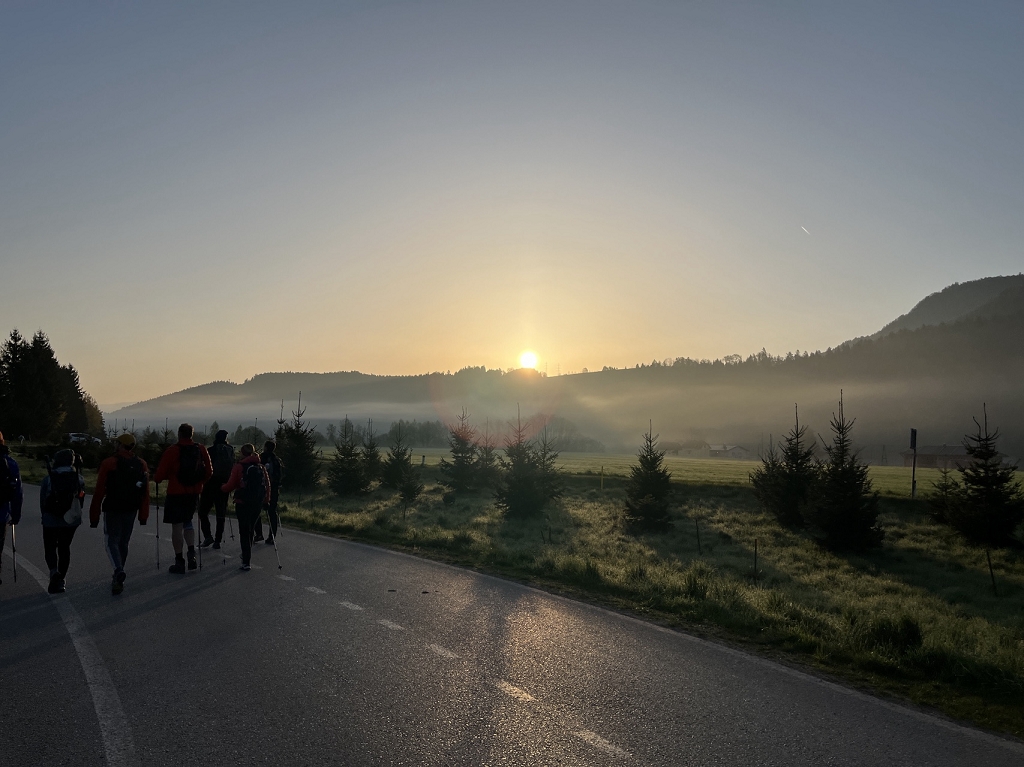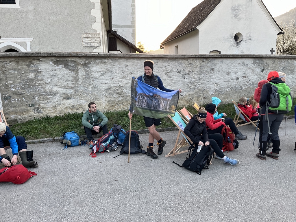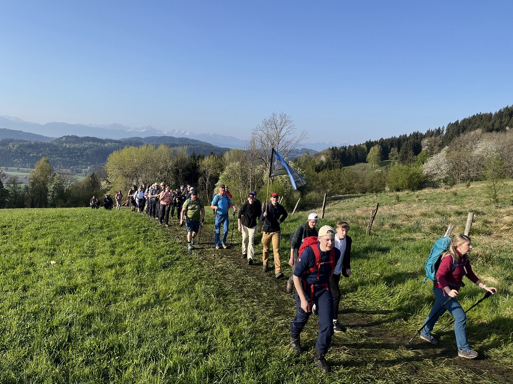 Am Donnerstag, dem 11.04., ging es mit dem Bus von St. Paul bis zum Magdalensberg, wo die Pilgergruppe um Mitternacht nach einem gemeinsamen Gebet startete. Schwer bepackt mit Proviant, Taschenlampen und der festen Entschlossenheit, diese Herausforderung anzunehmen, machten wir uns auf den Weg. Zuerst ging es vom Magdalensberg hinunter bis zu einem Gasthof, wo wir eine kurze Rast einlegten. Nach einer kurzen Stärkung ging es zum zweiten und steilsten Berg, dem Ulrichsberg. Umringt von unzähligen anderen Pilgern kämpften wir uns das steile Stück hoch und kamen erschöpft oben an. Dort legten wir eine wohlverdiente Pause ein. Nachdem also diese schwere Aufgabe bewältigt war, machte sich die Gruppe auf zum nächsten Berg, dem Veitsberg. Langsam wurde es heller, und die ersten Kinder standen schon am Wegesrand, um Süßigkeiten von den Wallfahrern zu empfangen. Übermüdet, aber mit dem Willen, auch noch die letzten zwei Berge zu erklimmen, setzten wir einen Schritt nach dem anderen. Langsam wurde es heiß und der Anstieg auf den Veitsberg zehrte an unseren Kräften. Nach einer Pause auf dem Hof des Bruders von Herrn Professor Maltschnig, wo wir hervorragend bewirtet wurden, ging es das letzte Stück auf den Lorenziberg hoch.
