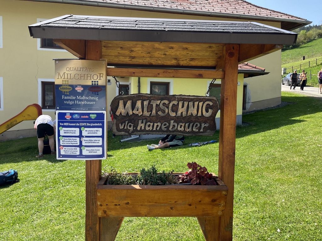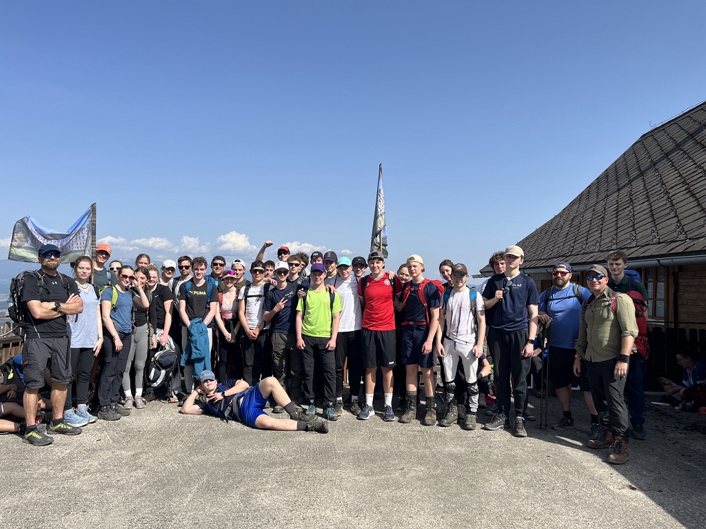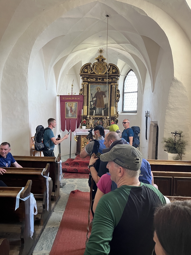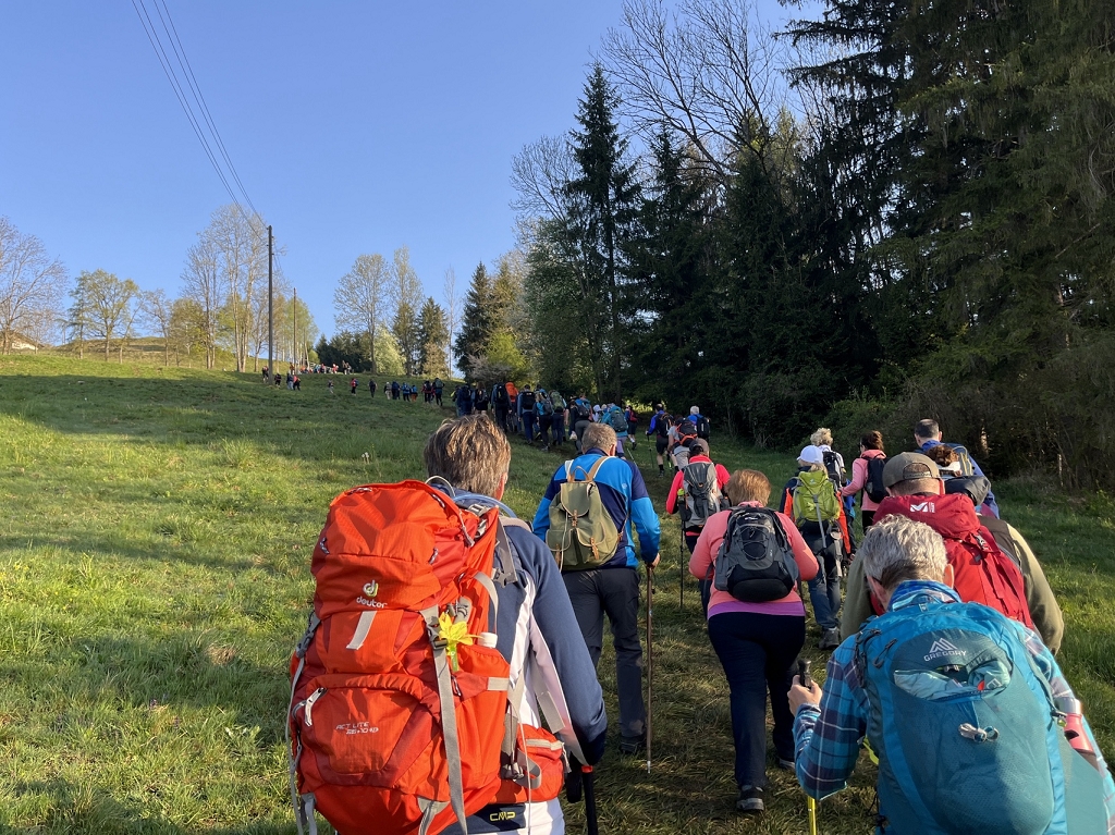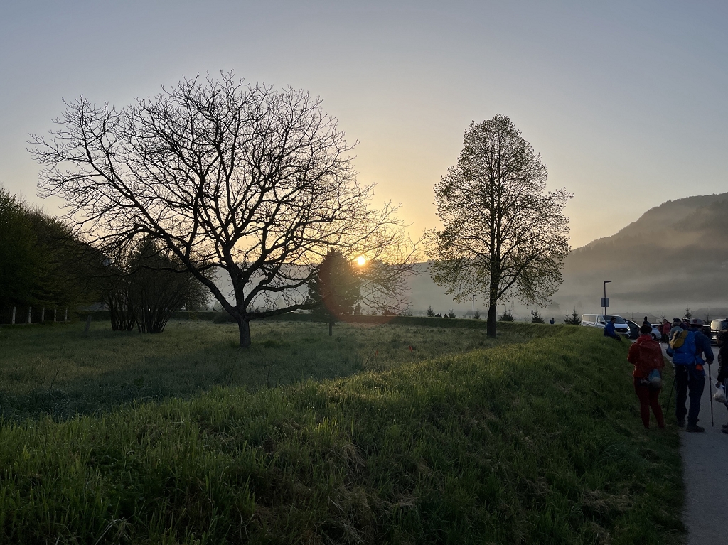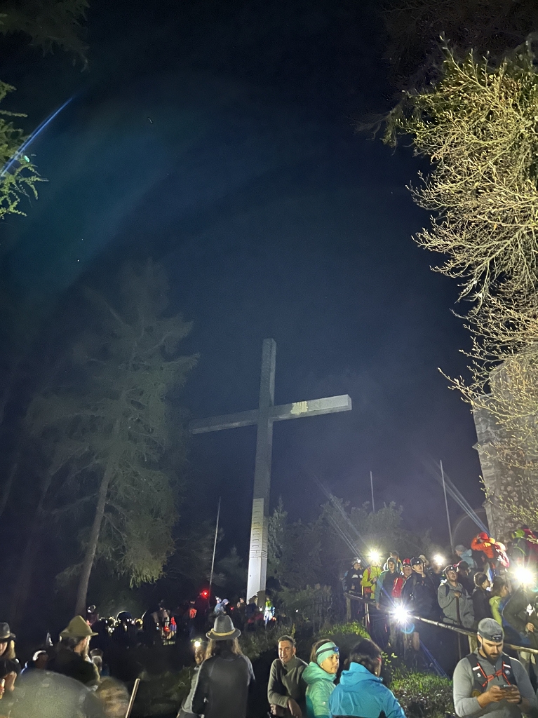 Am Donnerstag, dem 11.04., ging es mit dem Bus von St. Paul bis zum Magdalensberg, wo die Pilgergruppe um Mitternacht nach einem gemeinsamen Gebet startete. Schwer bepackt mit Proviant, Taschenlampen und der festen Entschlossenheit, diese Herausforderung anzunehmen, machten wir uns auf den Weg. Zuerst ging es vom Magdalensberg hinunter bis zu einem Gasthof, wo wir eine kurze Rast einlegten. Nach einer kurzen Stärkung ging es zum zweiten und steilsten Berg, dem Ulrichsberg. Umringt von unzähligen anderen Pilgern kämpften wir uns das steile Stück hoch und kamen erschöpft oben an. Dort legten wir eine wohlverdiente Pause ein. Nachdem also diese schwere Aufgabe bewältigt war, machte sich die Gruppe auf zum nächsten Berg, dem Veitsberg. Langsam wurde es heller, und die ersten Kinder standen schon am Wegesrand, um Süßigkeiten von den Wallfahrern zu empfangen. Übermüdet, aber mit dem Willen, auch noch die letzten zwei Berge zu erklimmen, setzten wir einen Schritt nach dem anderen. Langsam wurde es heiß und der Anstieg auf den Veitsberg zehrte an unseren Kräften. Nach einer Pause auf dem Hof des Bruders von Herrn Professor Maltschnig, wo wir hervorragend bewirtet wurden, ging es das letzte Stück auf den Lorenziberg hoch.