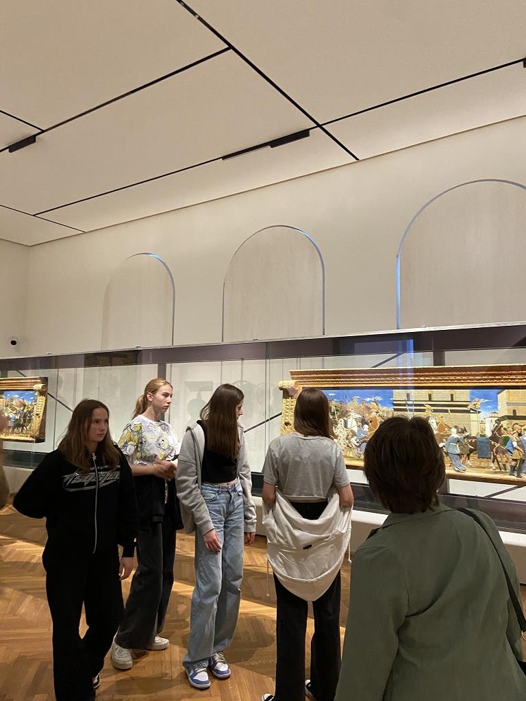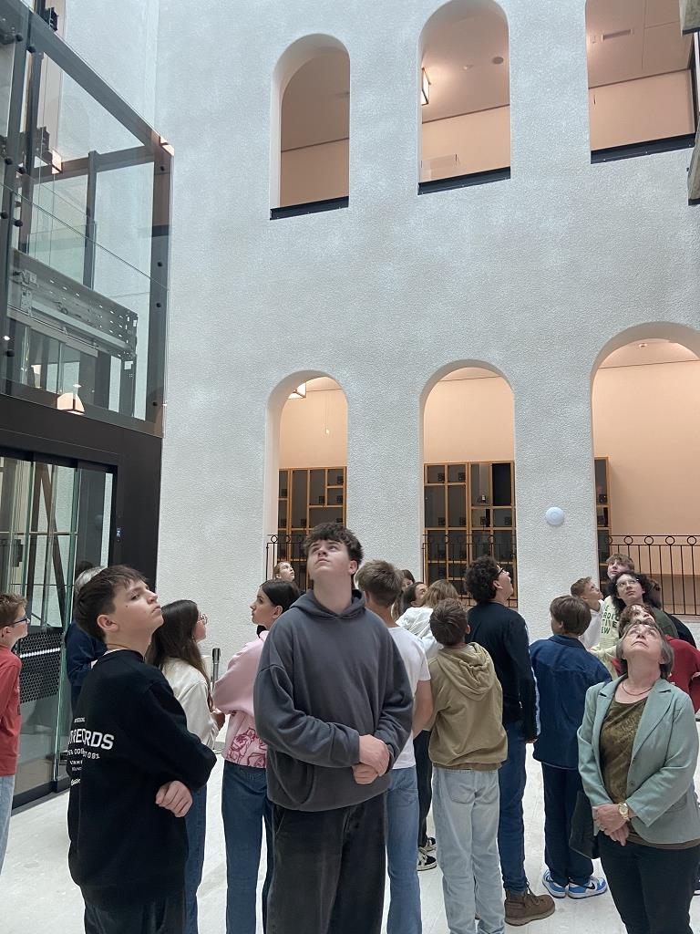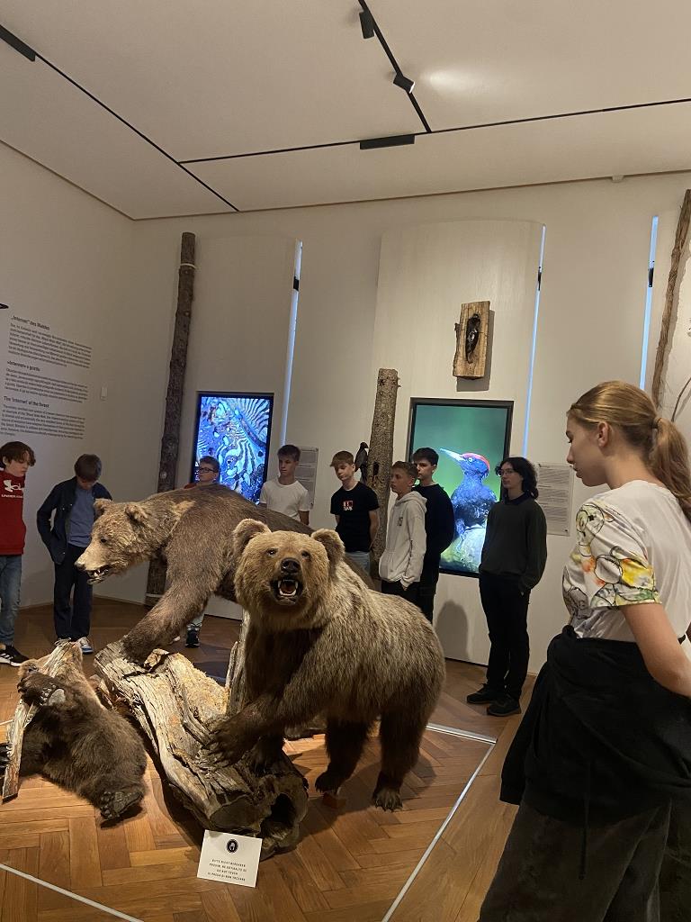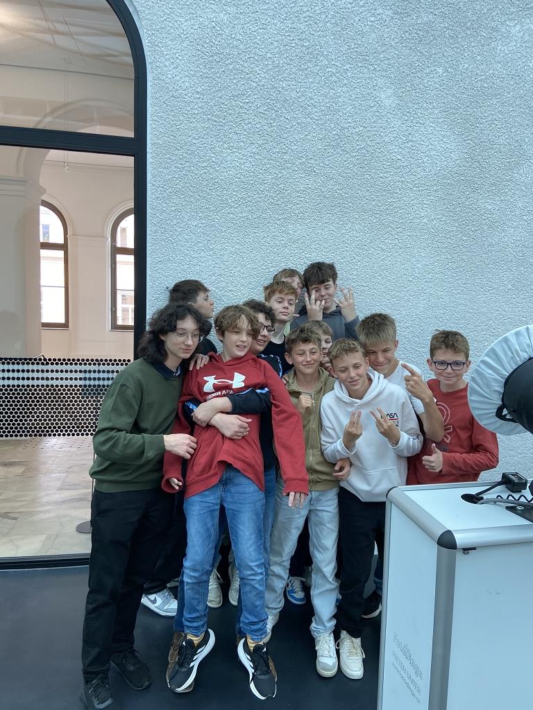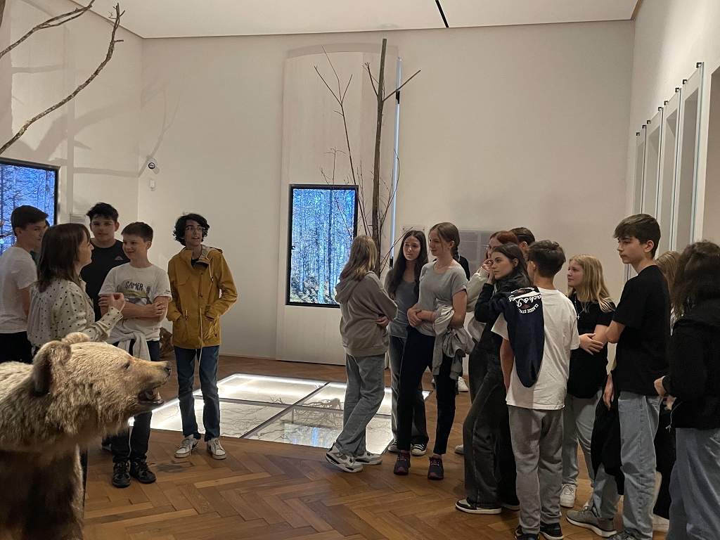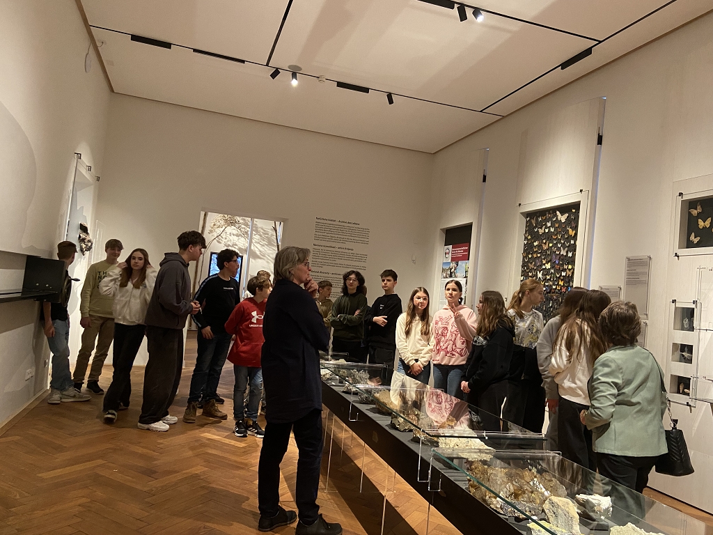 In Klagenfurt angekommen, ließ die Sonne leider auch auf sich warten. Nichtsdestotrotz ging es bewaffnet mit Regenschirmen nach der Mittagspause in den City Arkaden weiter zum neueröffneten kärnten.museum. Im Rahmen einer umfassenden Führung trafen die Schüler*innen unter anderem auf den „Lindwurmschädel“, das Großglockner-Relief sowie das faszinierende Dionysos-Mosaik aus Virunum.