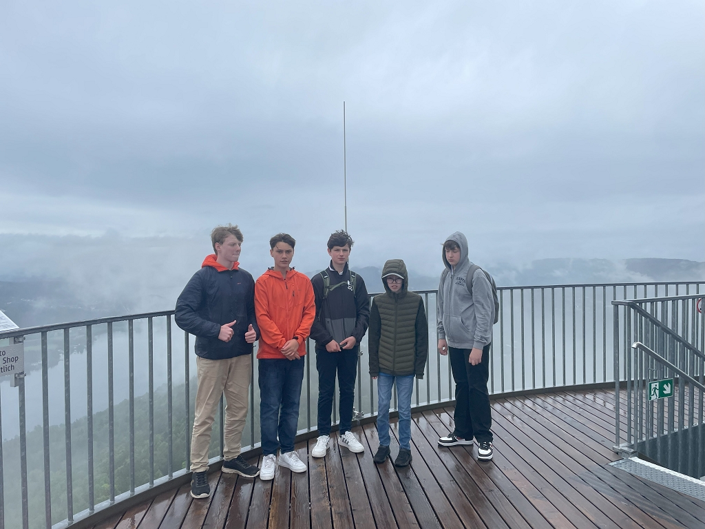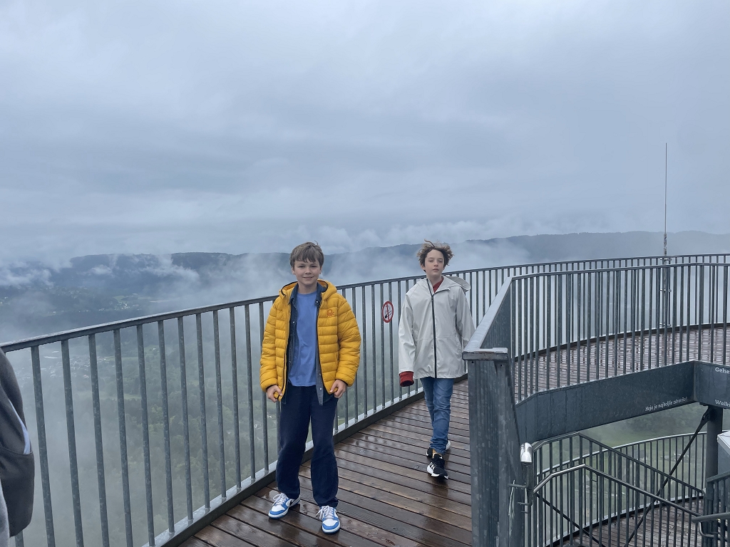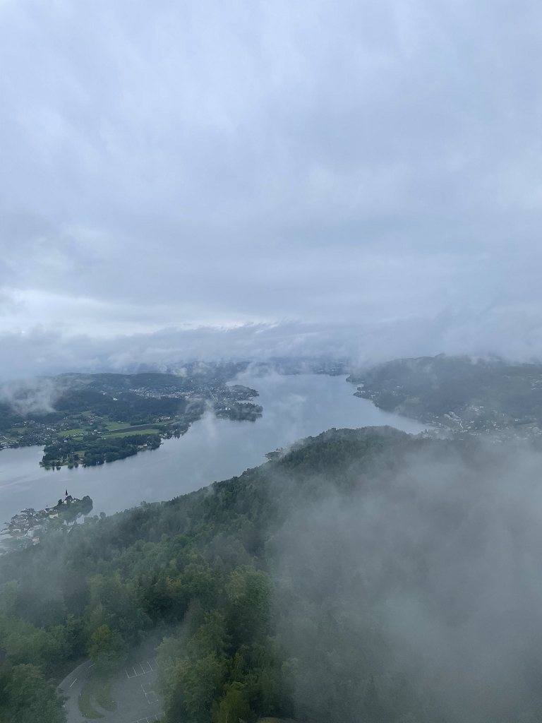 Als Erstes stand die Besichtigung des Pyramidenkogels am Programm. Der Stromausfall und die dadurch entstandene Sperre des Lifts sowie der Rutsche hinderte jedoch die Truppe nicht daran, die insgesamt 441 Stufen in Windeseile zu meistern. Auf knapp 71 Meter Höhe der exakt 100 Meter hohen Holz-Stahl-Konstruktion wurde schließlich trotz Wind und Regen der Ausblick über den Wörthersee genossen.