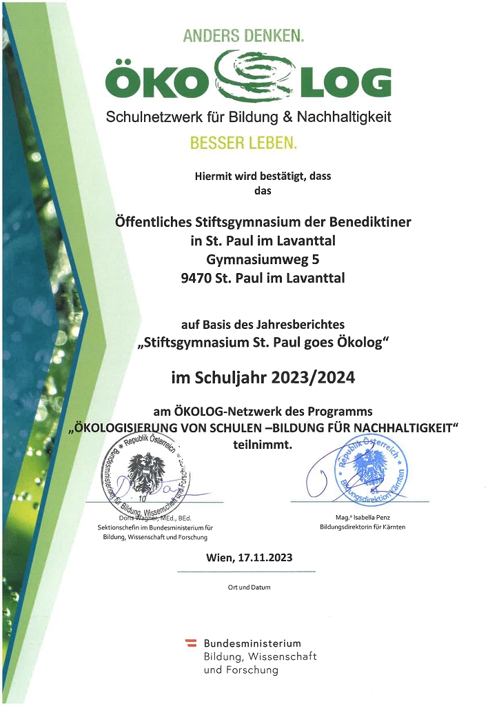 Das Stiftsgymnasium St. Paul darf sich über die Zertifizierung zur Ökolog-Schule durch das Bundesministerium für Bildung, Wissenschaft und Forschung freuen.