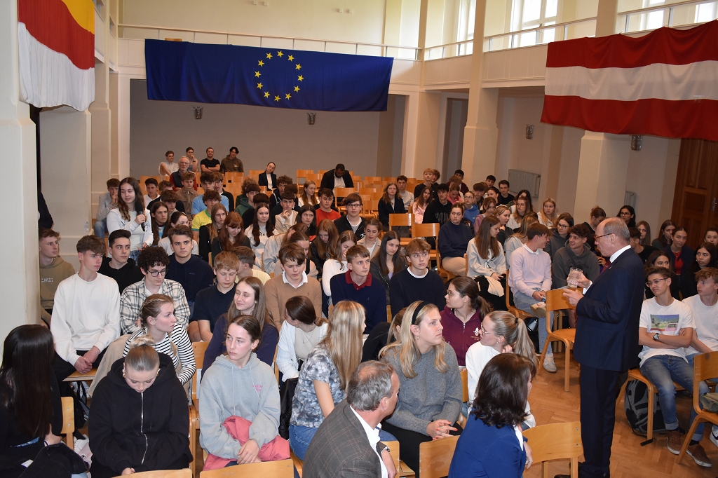 Nach der herzlichen Begrüßung durch Direktorin Mag. Ines Leschirnig-Reichel gab Dr. Othmar Karas spannende Einblicke in seinen politischen Werdegang, der als Klassensprecher in Niederösterreich begann. Als überzeugter Europäer beleuchtete er die vielfältigen Aufgaben des Europäischen Parlaments.