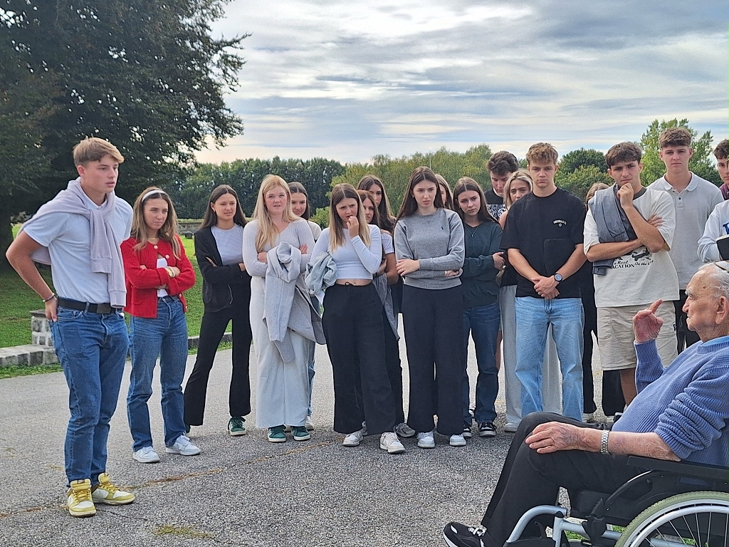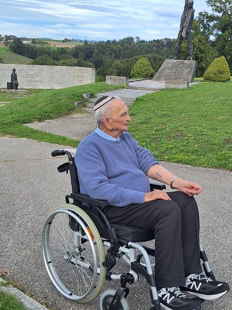 Der Zufall wollte es, dass unsere Auseinandersetzung mit diesen Themen von einer ungeplanten Begegnung ihre größtmögliche Authentizität erfuhr. Beim Park der Denkmäler, dem ehemaligen SS-Lager, traf die 8.a Klasse, zuerst unbedarft und ohne Neugier, auf einen alten Mann im Rollstuhl, der zunächst als einfacher Besucher der Gedenkstätte wahrgenommen wurde. Wie sich rasch zeigte, handelte es sich aber um einen der letzten Überlebenden der KZ-Maschinerie, Avigdor Neumann, über den gerade eine Dokumentation gedreht wurde. Er forderte als einer, der im Alter von 14 Jahren das KZ überlebt hatte und heute als 93-Jähriger in Israel wohnt, die Schüler:innen auf, mit ihm ins Gespräch zu kommen, erzählte in berührender Art über seine Ankunft im KZ Mauthausen / Gunskirchen, seine Erfahrungen mit der herrschenden Gewalt und zeigte uns seine am Unterarm eintätowierte Häftlingsnummer B14665.