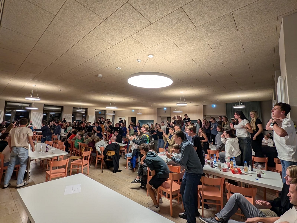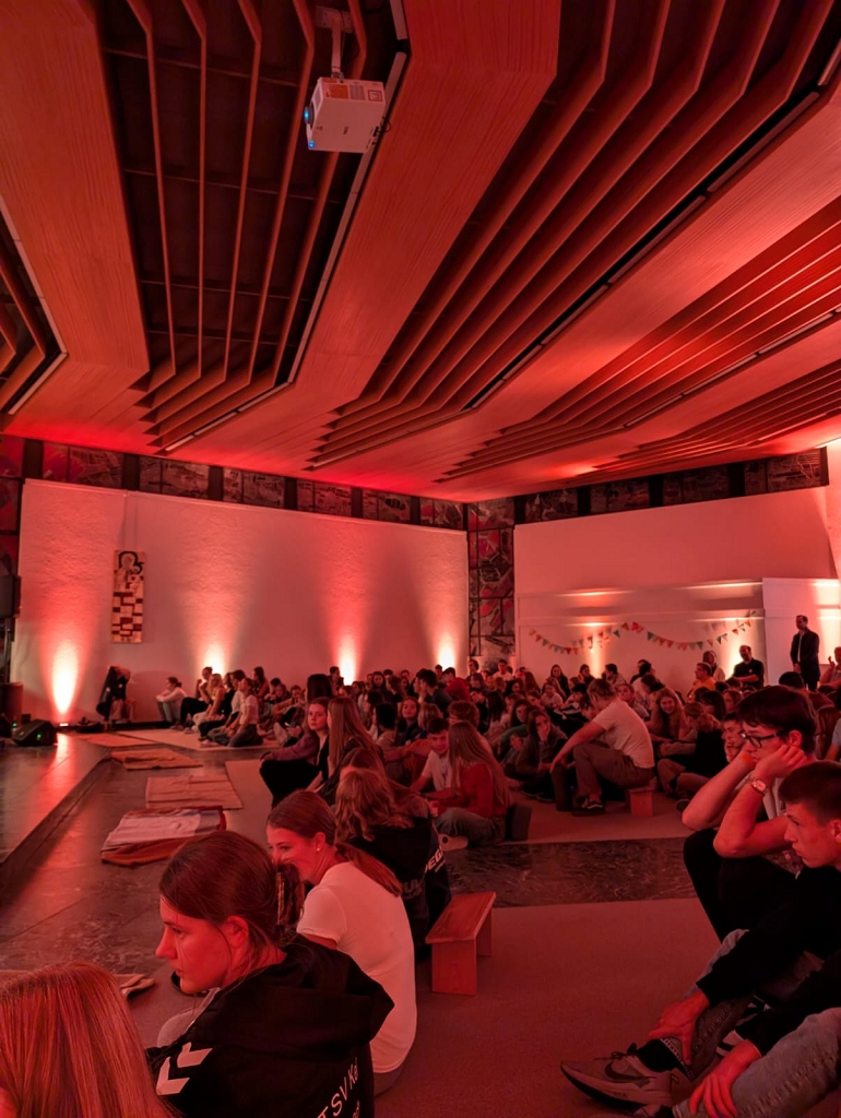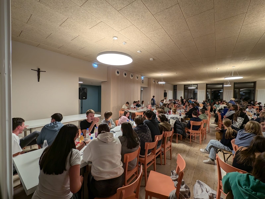Nach der Ankunft in mehreren Bussen führte Schulleiter OStD Markus Binzenhöfer eine der ersten Gruppen durch die fast fertig umgebaute Schule. Danach begrüßten er, Abt Michael Reepen OSB und das Team des DeBeJu (Deutscher Benediktinischer Jugendkongress), bestehend aus Alumni des Egbert Gymnasiums Münsterschwarzach, unterstützt von Frater Julian und einigen Lehrenden, die Jugendlichen feierlich in der Aula. Sie luden alle ein, im Lied „Laudate omnes gentes“ (Lobet den Herrn alle Völker) mitzusingen und sich auf das weltumspannend Einigende des Glaubens zu besinnen. Der erste Abend endete, wie erwartet, mit einem Gebet in der Lichternacht.
