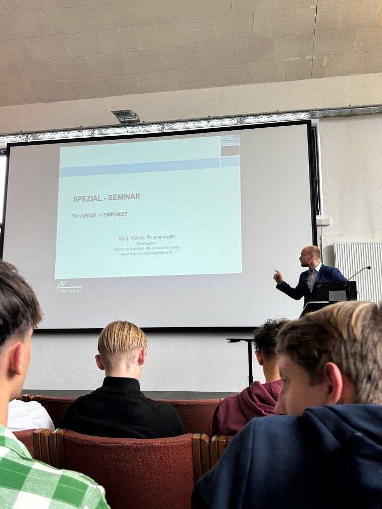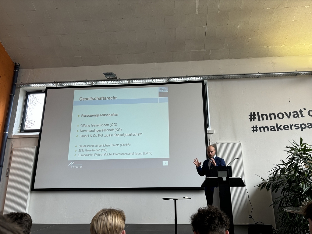 Im Anschluss an die Führung hielt ein Notar einen Vortrag über die Gründung eines Unternehmens und die wesentlichen Aspekte, die dabei zu beachten sind. Zur Veranschaulichung des Themas wurden am Ende des Vortrags die Gesellschaftsverträge von zwei bekannten Firmen betrachtet.