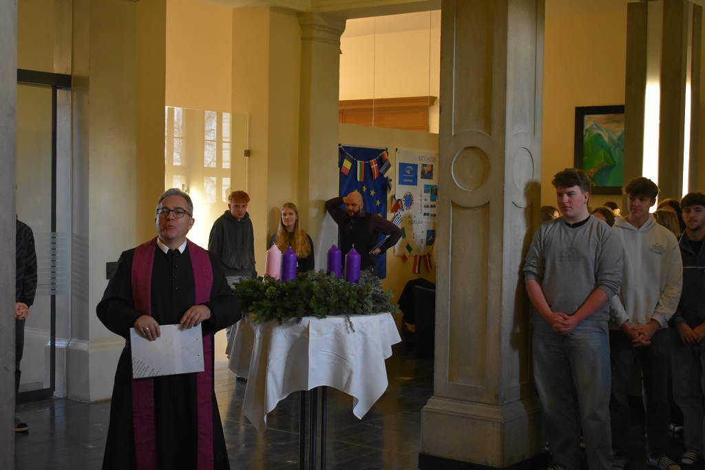 Advent, das heißt warten, nicht nur auf die Ferien, sondern auf das Licht der Welt, das in unsere Mitte kommt. Advent heißt, in einer Zeit der Hektik und der selbstgemachten Eile zur Ruhe zu kommen. Die Einladung, Tag für Tag ein paar Minuten der Ruhe für sich zu finden, den Sinn des Wartens auf das Licht in der dunklen Zeit des Jahres zu entdecken, diese Einladung gilt nicht nur unseren Schülerinnen und Schülern, Lehrerinnen und Lehrern bei den Feiern in unserer Schule, diese Einladung gilt Ihnen allen und begleitet Sie durch die Adventszeit. ent.