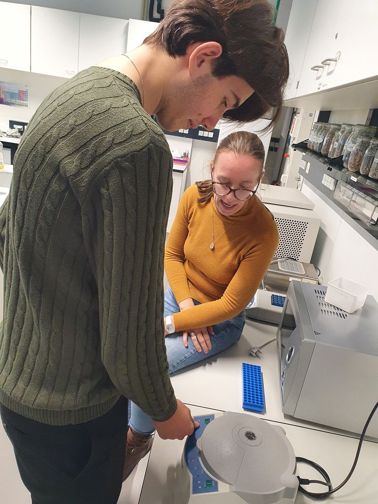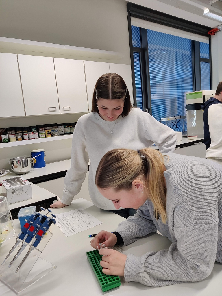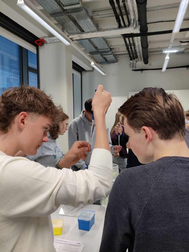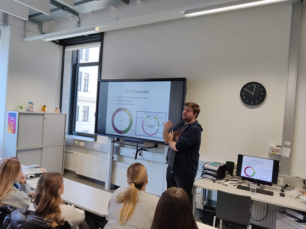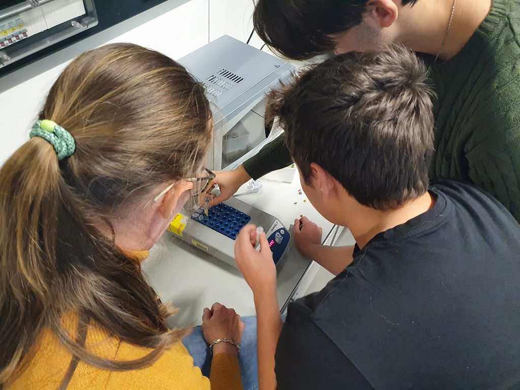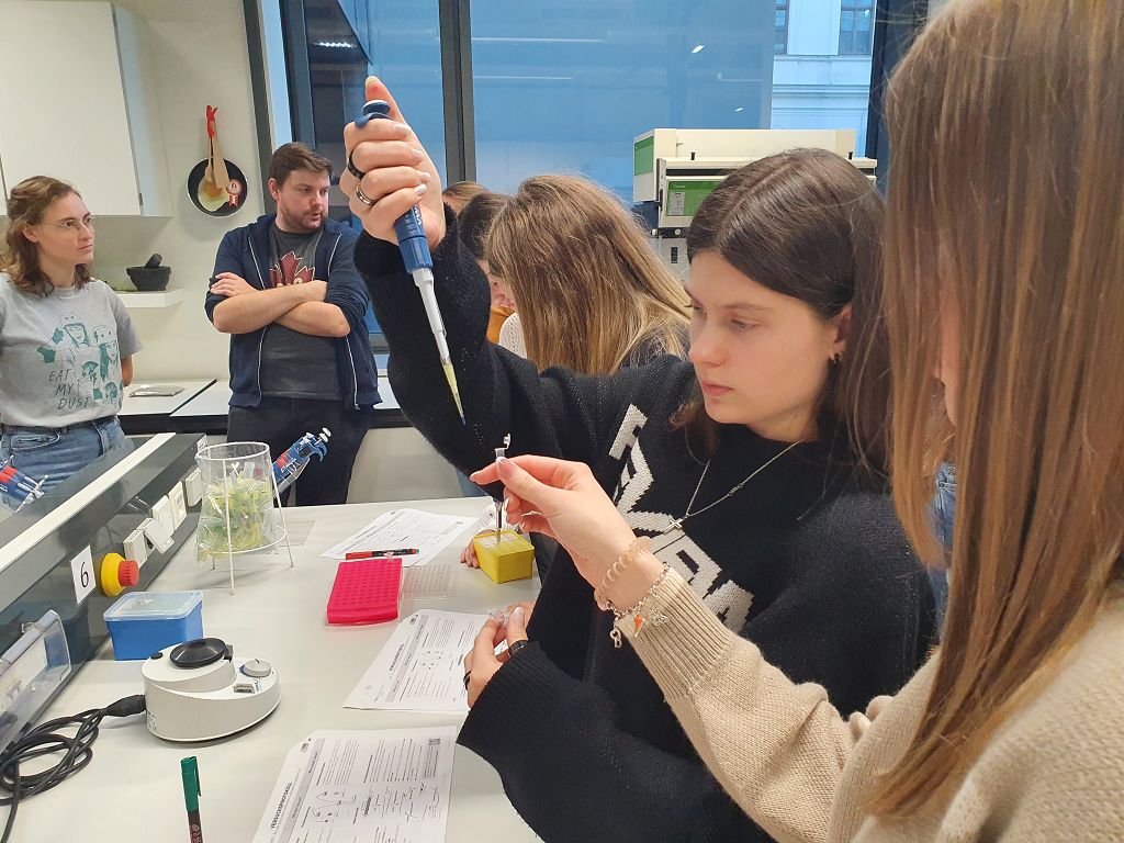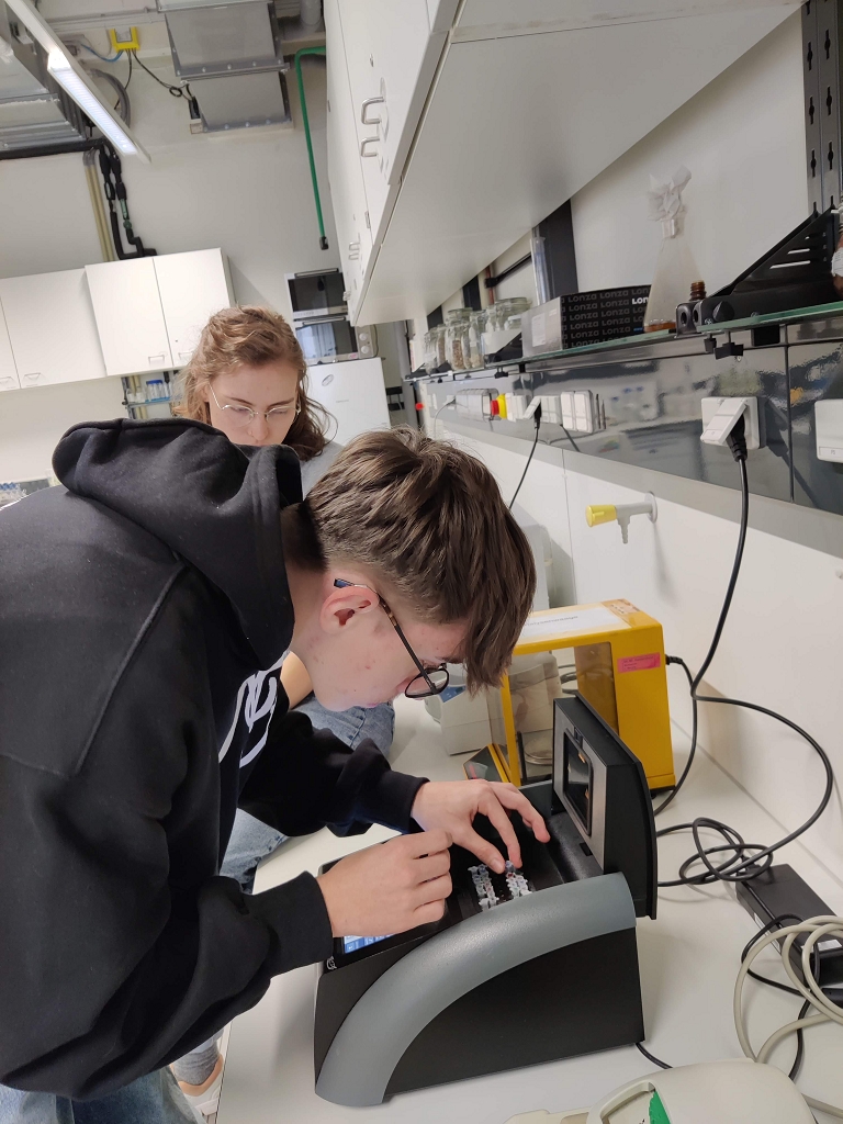 Unsere Aufgabe im Labor war es, mit Hilfe der Polymerase-Kettenreaktion (PCR) herauszufinden, ob in bestimmten Lebensmitteln gentechnisch veränderte Organismen (GVO) enthalten sind. Nach einer kurzen theoretischen Einführung über GMOs wurden wir in die Handhabung der Laborgeräte eingewiesen. Dann ging es an die Arbeit. Zuerst wurden die bereitgestellten Lebensmittelproben (Knoblauch, Soja, Zwiebeln, Kornspitz und Semmeln) vorbereitet und die PCR-Gefäße in den Thermocycler gestellt, in dem die eigentliche Reaktion stattfand. Nach diesem Arbeitsschritt fügten wir, die Laboranten und Laborantinnen des Tages, noch einen Farbstoff hinzu, damit die Proben bei der anschließenden Auswertung unter Blaulicht sichtbar werden. Die fertigen Proben wurden auf das Agarosegel pipettiert und die Gelelektrophorese wurde gestartet. Zum Schluss wurden die Ergebnisse in der Gruppe besprochen. Nach getaner Arbeit genossen wir unsere Mittagspause im Univiertel. Nach der Pause fand der Wechsel zwischen Labor und Museum statt.