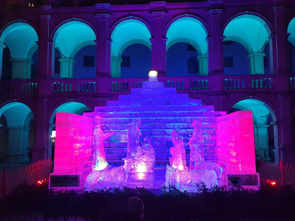 Zum Abschluss des Tages trafen sich die beiden Gruppen wieder und wir machten uns gemeinsam auf den Weg zur Eiskrippe im Hof des Landhauses, wo wir die vorweihnachtliche Stimmung genießen konnten.