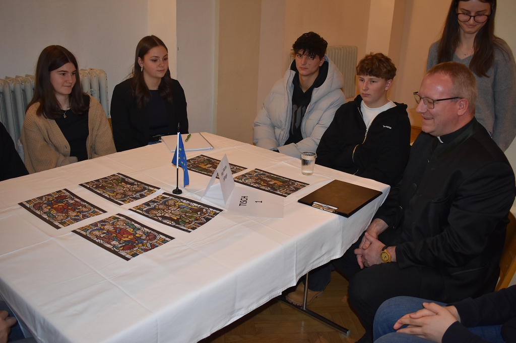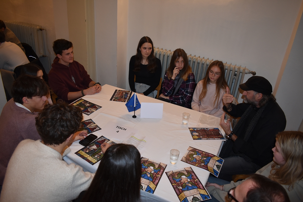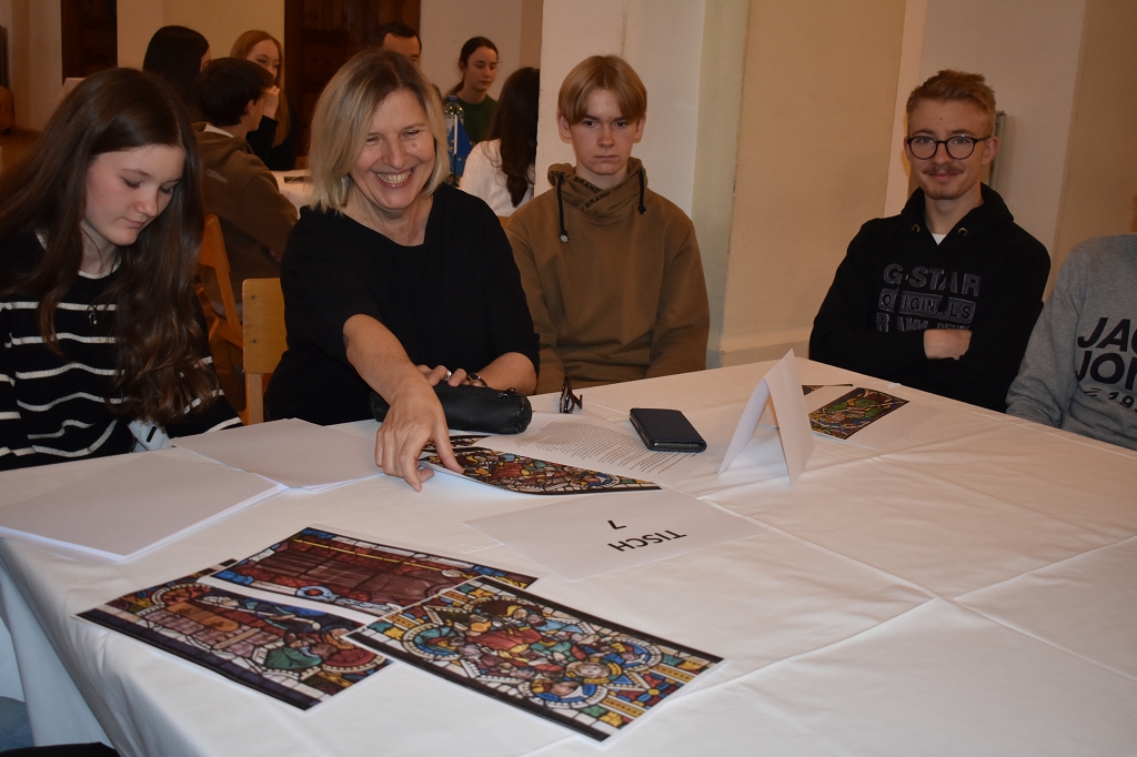 Als Grundlage für die anschließende Diskussion an neun Tischen diente etwas ganz Besonderes: Ausschnitte aus den Glasfenstern der Pfarrkirche Bad St. Leonhard, die in der ersten Hälfte des 20. Jahrhunderts verkauft wurden und nun in „The Cloisters“, einer Außenstelle des Metropolitan Museum of Art in New York, ausgestellt sind. In den Motiven der Glasfenster aus dem 14. Jahrhundert lassen sich bei genauer Betrachtung einige der Grundrechte der EU-Charta erkennen.