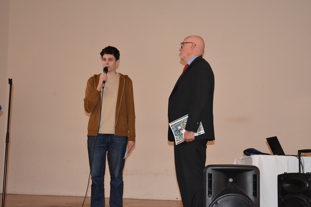 Nach der Europahymne, intoniert vom Bläserquartett der Schule (Andreas Streit 8b, Tobias Streit 5b, Elias Zweytick 7b, Clemens Hinteregger 4b) unter der Leitung von Prof. Thomas Zdravja, eröffnete die Direktorin Mag. Ines Leschirnig-Reichel die Veranstaltung. Im Anschluss an die Grußworte von Bürgermeister Stefan Salzmann und Dr. Christian Gsodam, Europäischer Diplomatischer Dienst, folgte die Videobotschaft des LH Dr. Peter Kaiser. In dieser unterstrich er die Wichtigkeit der europäischen Grundwerte, vor allem der Bildung, und zeigte sich hocherfreut über das Interesse der Jugendlichen an der Thematik.