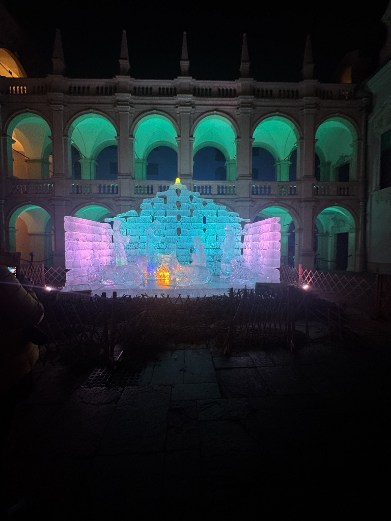 Bevor sie sich zum Schauspielhaus begaben, legten sie einen kleinen Zwischenstopp bei der berühmten Eiskrippe, die im Grazer Landhaushof ausgestellt ist, ein. Die kunstvoll gestalteten Figuren aus glitzerndem Eis zogen die Schüler:innen sofort in ihren Bann. Die beeindruckende und detailgetreue Arbeit sowie die stimmungsvolle Beleuchtung sorgten für eine einzigartige Atmosphäre und einen großartigen Start in den Abend.
