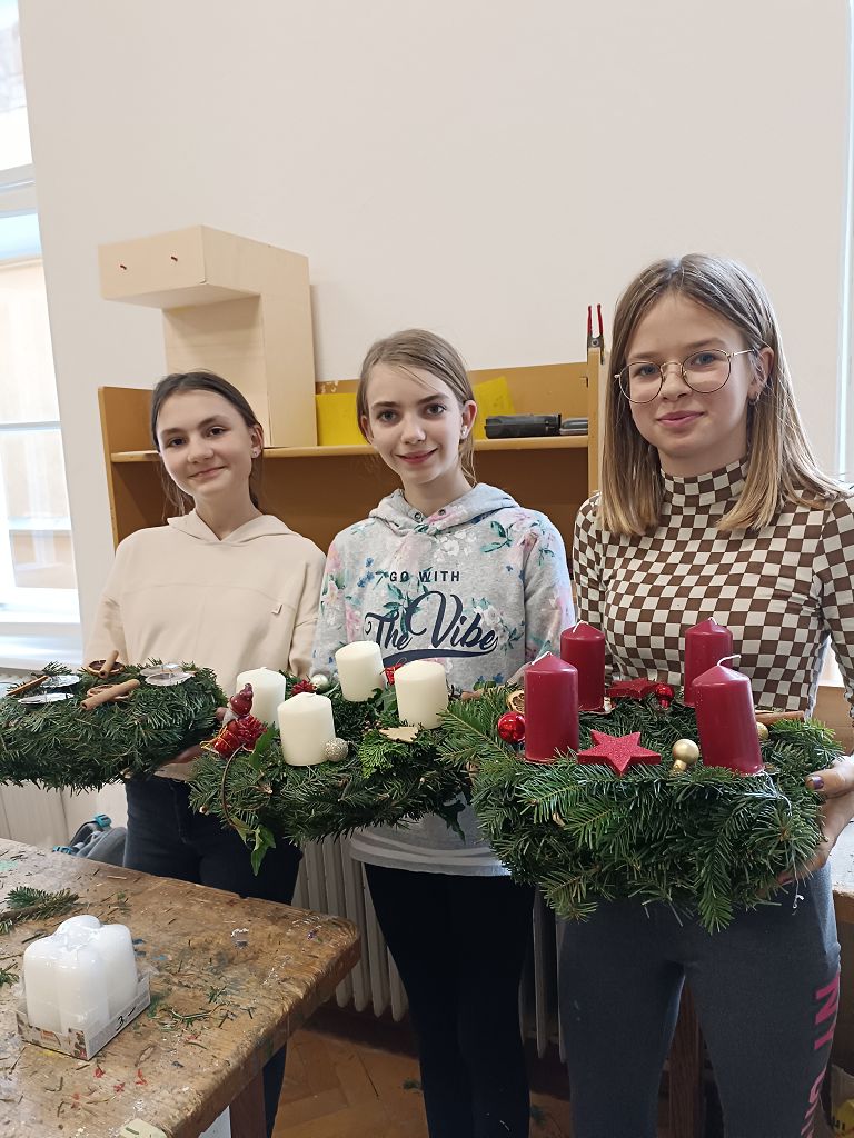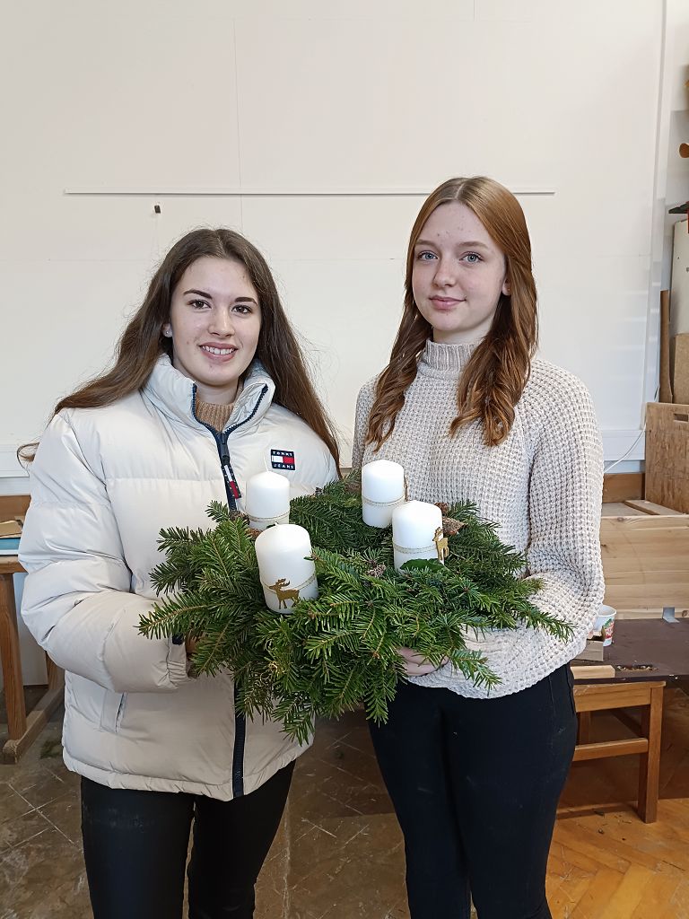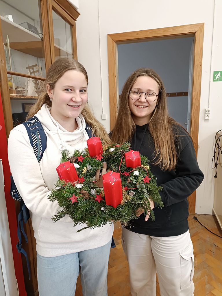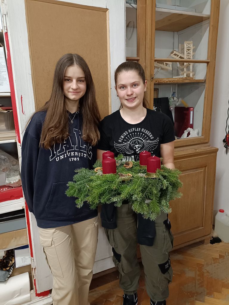 Besonders hervorzuheben ist, dass einige SchülerInnen sich der herausfordernden Aufgabe stellten, die riesigen Adventkränze für die Schule anzufertigen.