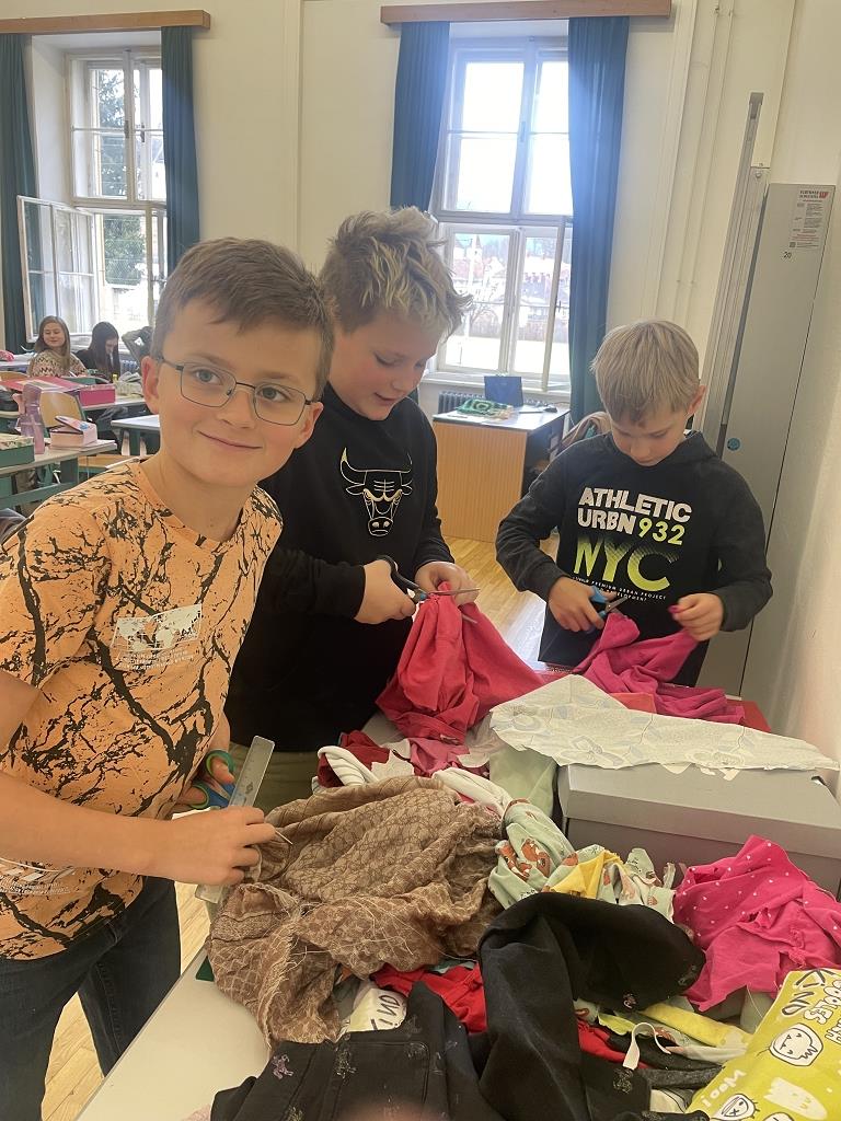 Anschließend wurde das Märchen mithilfe von Mixed Media bildnerisch umgesetzt. Bei dieser Technik werden verschiedene Materialien auf dem gleichen Malgrund verwendet. Die Kinder malten das Bett mit der schlafenden Prinzessin auf ein Zeichenblatt und beklebten es mit Stoffstücken, Pappe und einer echten Erbse. Besonders für die Buben war es zuerst befremdlich, alte Kleidung und Stoffreste zerschneiden zu dürfen. Als die erste Scheu verflogen war, wurde nach Lust und Laune ausgeschnitten, geklebt und gemalt. Schließlich wurden die fertigen Bilder in den jeweiligen Klassen bzw. im Kunstsaal ausgestellt. Als Abschluss des Märchenprojektes durften die Schüler:innen noch ein Diorama in einer Schuhschachtel basteln. Sie waren in der Wahl der Materialien völlig frei und konnten eine Szene aus ihrem Lieblingsmärchen dreidimensional darstellen. Hier waren besonders räumliche Vorstellungskraft und logisches Denken gefragt, denn Türme und Brunnen sowie Schlösser und Torbögen aus Papier und Pappe mussten gebastelt und befestigt werden.