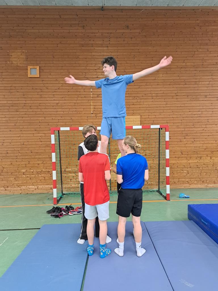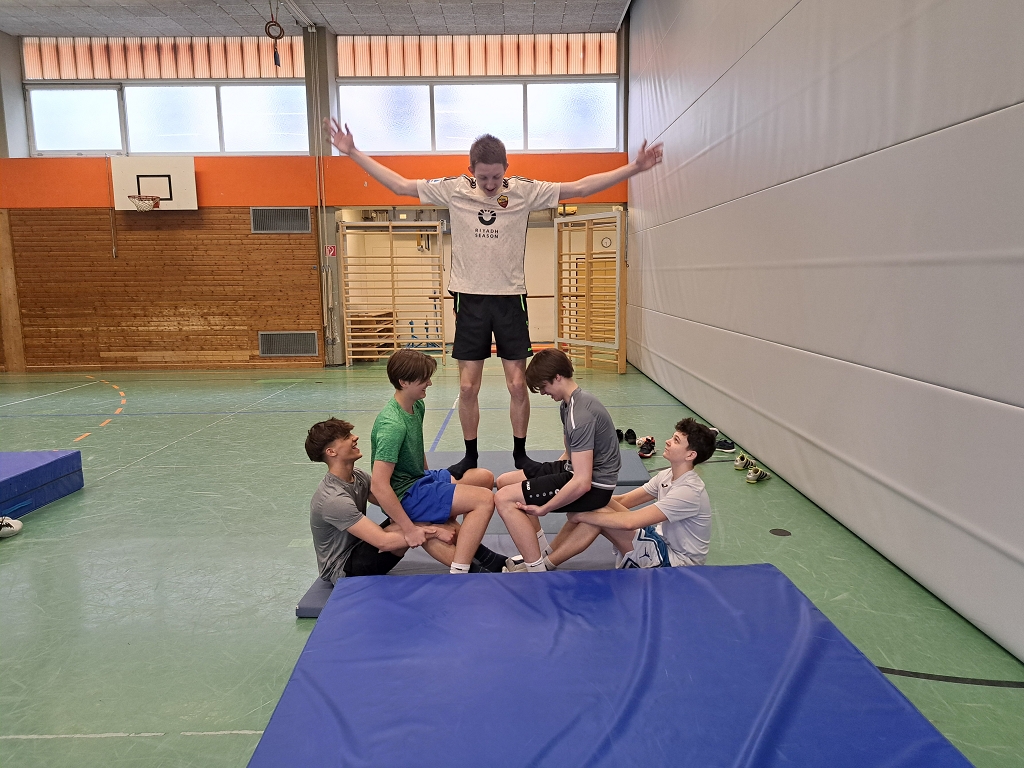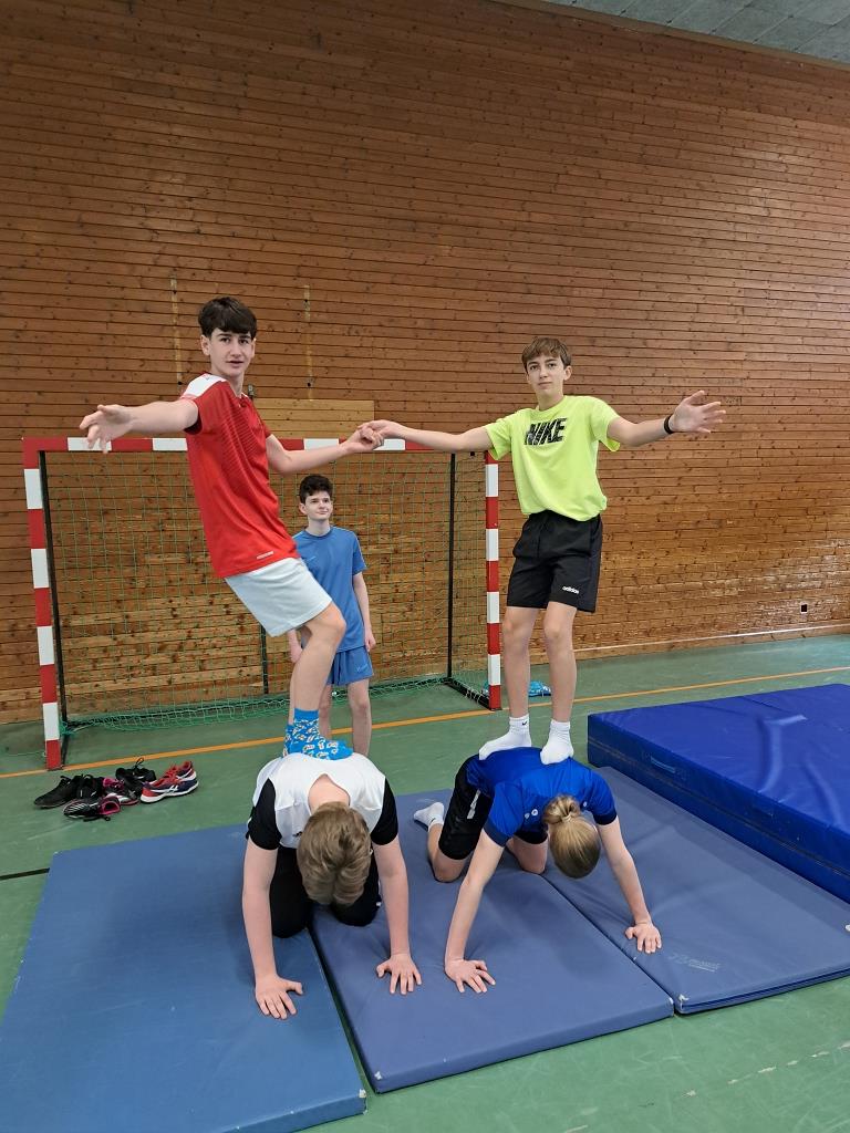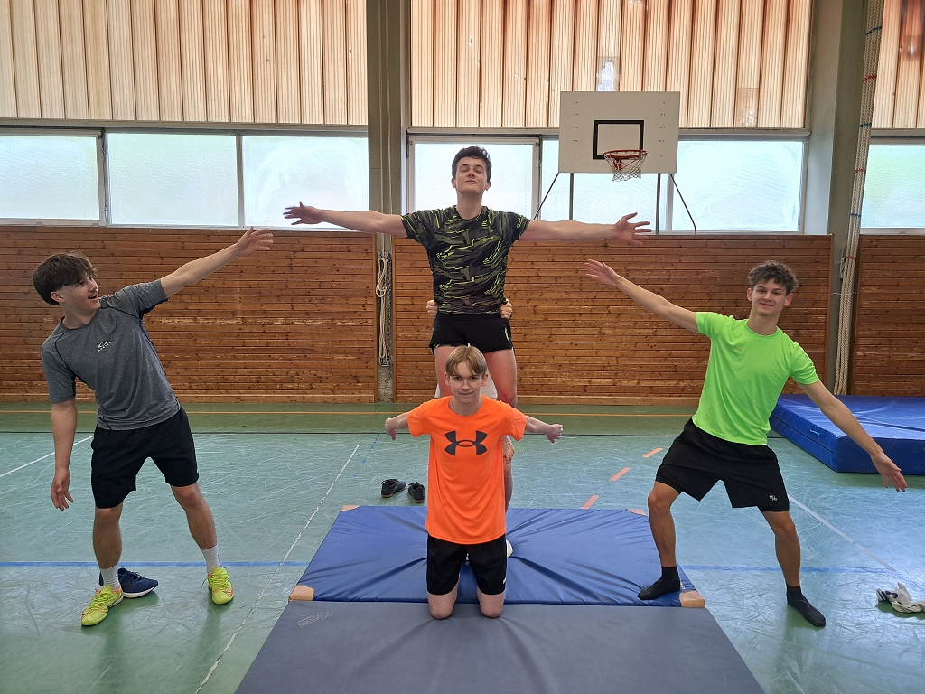 Akrobatik und Tanz sind Disziplinen, die häufig mit Mädchen in Verbindung gebracht werden. Doch in letzter Zeit haben auch unsere Burschen der 6a und 6b diese außergewöhnliche Herausforderung angenommen. Zu Beginn setzten sie sich mit den Grundlagen der Akrobatik und des Tanzes auseinander und versuchten, verschiedene akrobatische Positionen und Pyramiden zu bilden. Zudem wurde ein gemeinsamer Tanz zu Queens Another One Bites the Dust einstudiert.
