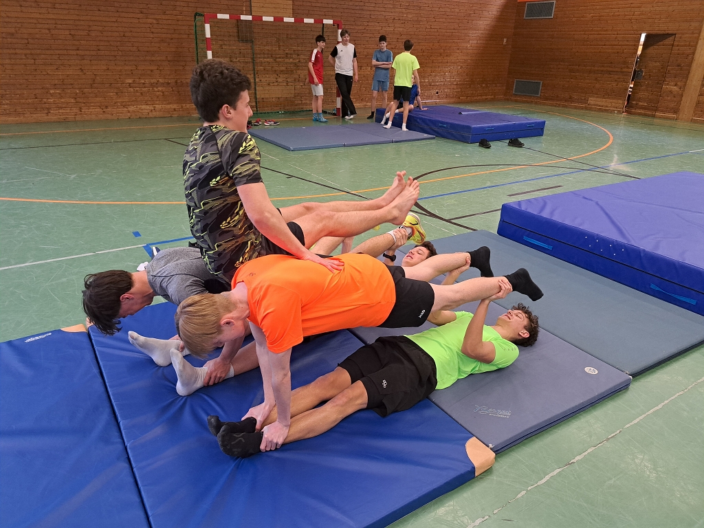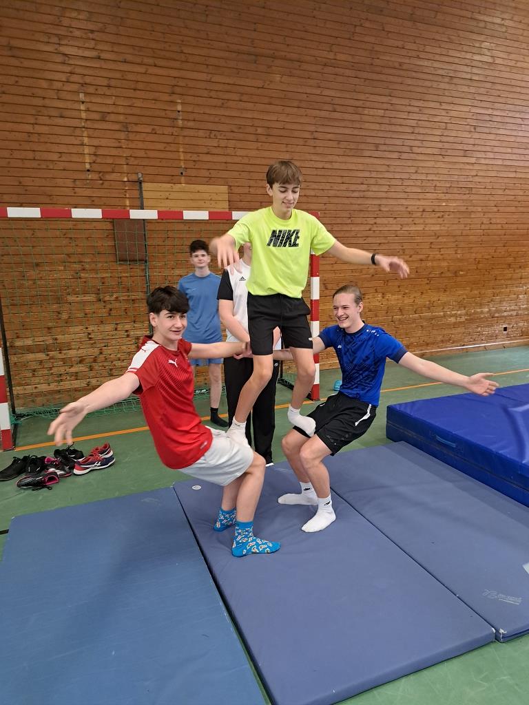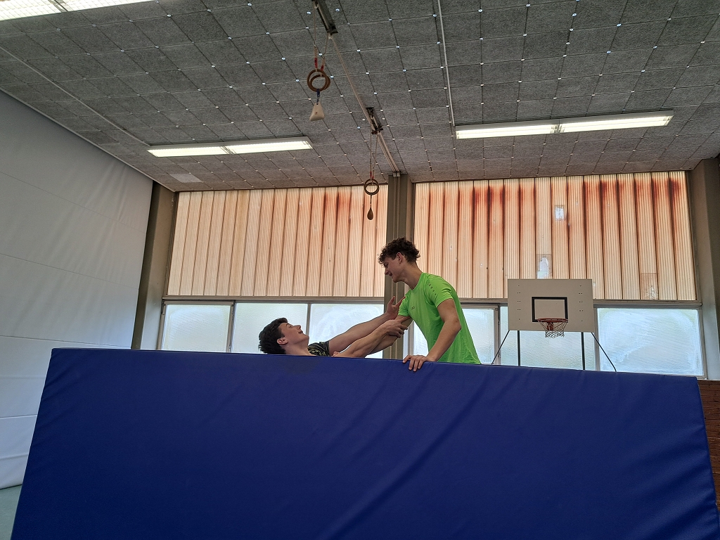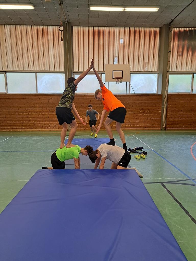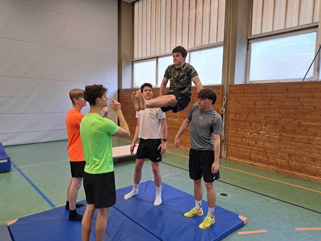 Akrobatik und Tanz sind Disziplinen, die häufig mit Mädchen in Verbindung gebracht werden. Doch in letzter Zeit haben auch unsere Burschen der 6a und 6b diese außergewöhnliche Herausforderung angenommen. Zu Beginn setzten sie sich mit den Grundlagen der Akrobatik und des Tanzes auseinander und versuchten, verschiedene akrobatische Positionen und Pyramiden zu bilden. Zudem wurde ein gemeinsamer Tanz zu Queens Another One Bites the Dust einstudiert.