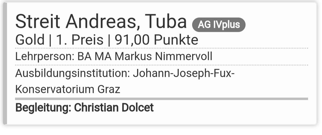 Franziska Zarfl brillierte auf der Klarinette und erspielte sich einen 1. Preis, während Clemens Hinteregger mit seinen Auftritten auf der Trompete und dem Flügelhorn ebenfalls einen 1. Preis erhielt. In der Blechbläser-Kategorie überzeugte zudem Matteo Zellnig, der auf dem Euphonium und Tenorhorn antrat und ebenfalls den 1. Preis erhielt.