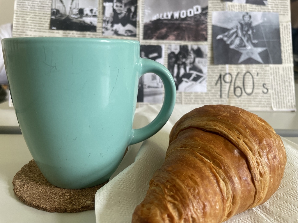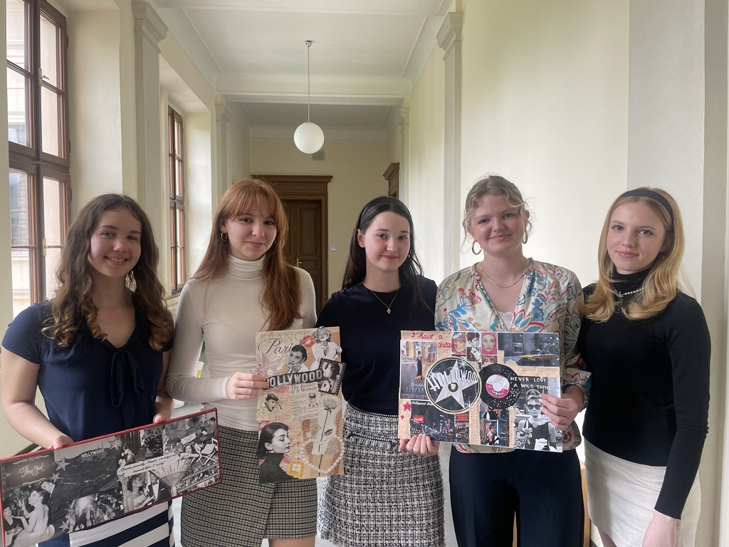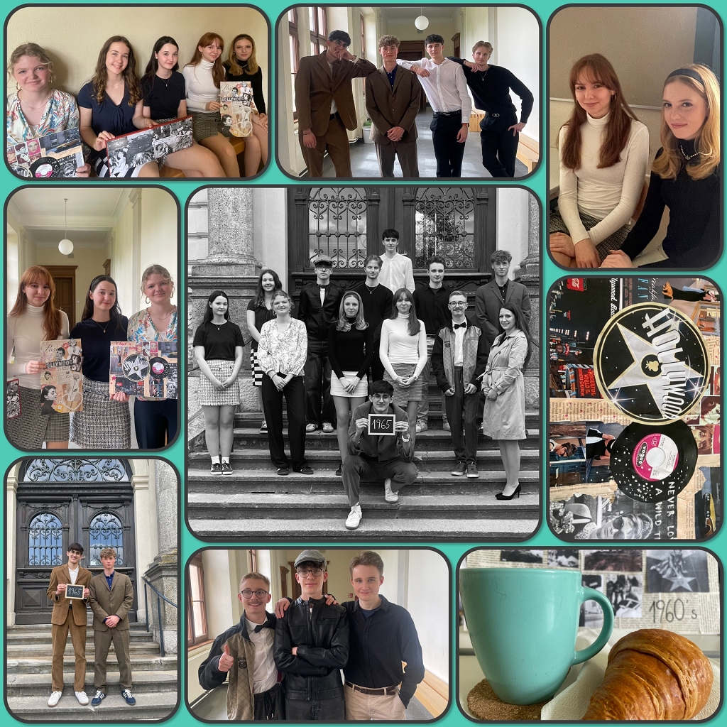 Inspired by the movie, we created 1960s-themed mood boards, which are compilations of small, printed images and quotes to convey a general idea or feeling about a topic. On April 23rd, the finished mood boards were finally presented to the entire group. Thanks to Domenik Hochegger, 7a, the presentations felt more like conversations, because he had brought croissants for all of us, so that we could have breakfast as in the movie. We all enjoyed the cozy atmosphere of this morning. Moreover, everybody wore an outfit inspired by the 1960s. The girls had put on miniskirts and headbands; the boys wore leather jackets or had borrowed their fathers’ and grandfathers’ suits. Finally, a class photo from 1965 was faked for fun.