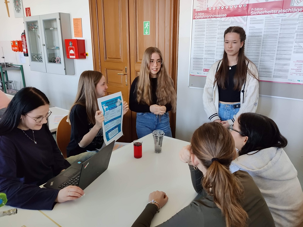 Nach einer kurzen Einführung in Form eines Videos verfassten die Klassen in Gruppen Texte und Mindmaps zum Thema „Grüne Chemie in Österreich“. Daraufhin widmeten sich die Schülerinnen uns Schüler im Chemie- und Informatikunterricht verschiedenen Fragestellungen rund um die Verwertung von Abfällen. Sie führten Recherchen und Experimente durch, erarbeiteten kreative Plakate und besuchten das Umweltzentrum St. Andrä sowie die Zentralkläranlage Mettersdorf, um die Prozesse der Abfall- und Wasseraufbereitung hautnah zu erleben.