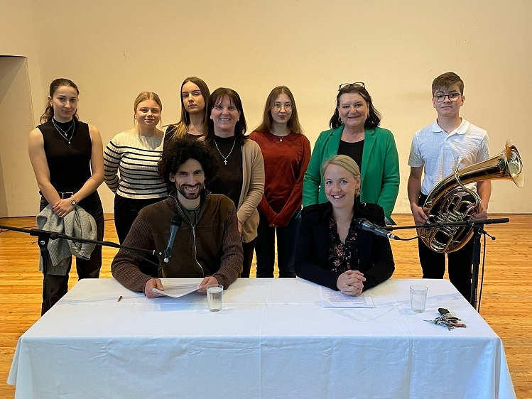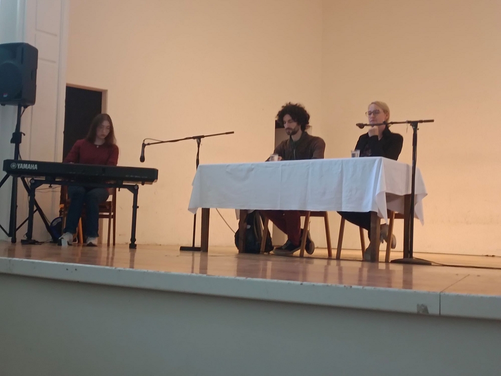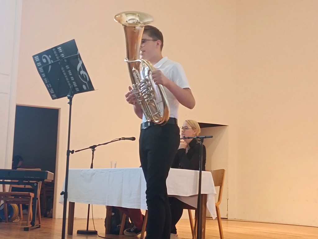 Die Schülerin Valerie Breidler (7a) am Klavier – sie studiert zusätzlich am Mozarteum in Salzburg Klavier und Blockflöte – und der Schüler Matteo Zellnig (2c) auf seiner Konzerttuba untermalten diese besondere literarische Lesung musikalisch hervorragend.