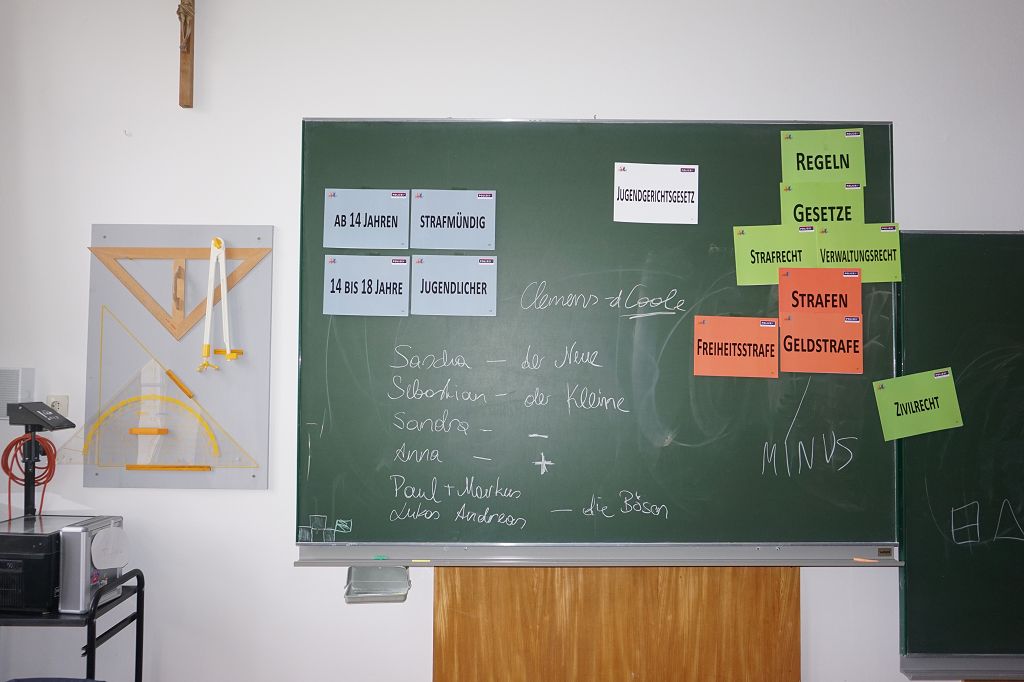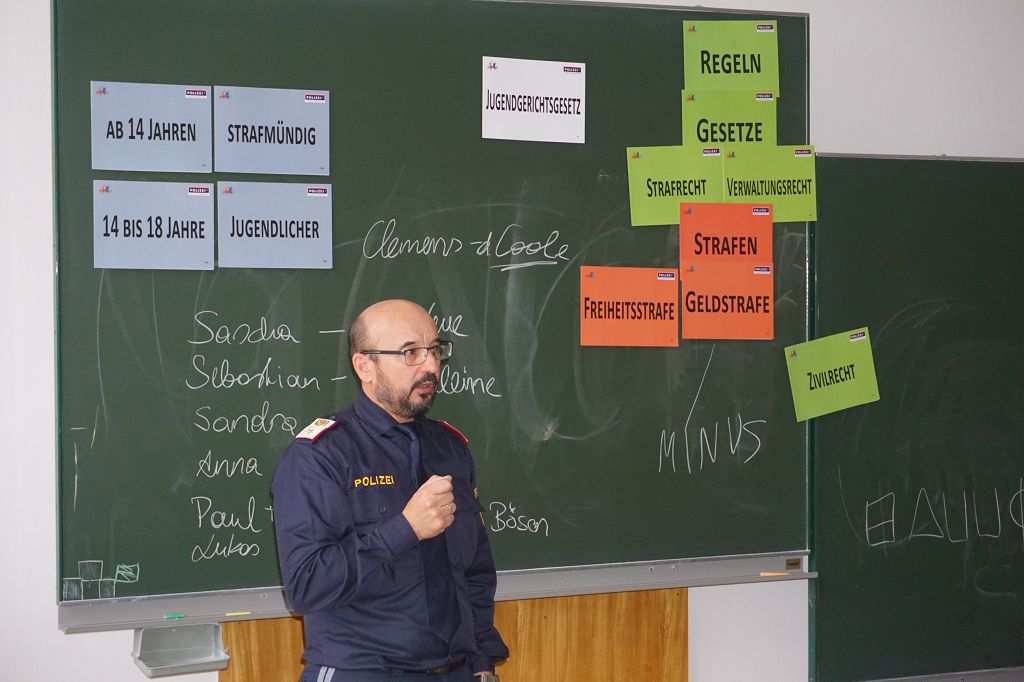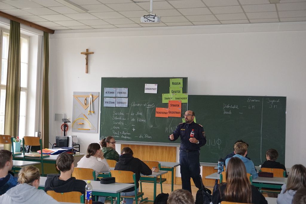 Während die 3. Klassen das Jugendschutzgesetz kennenlernten, präsentierte BezInsp. Johann Berger den Jugendlichen der 4. Klassen das Jugendstrafrecht. Sie analysierten gemeinsam ein Beispielvideo und diskutierten darüber, was es bedeutet, strafmündig zu sein und Zivilcourage zu beweisen.