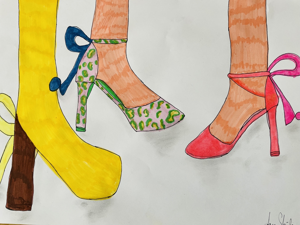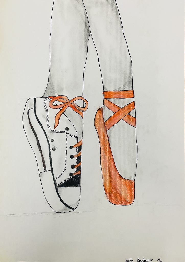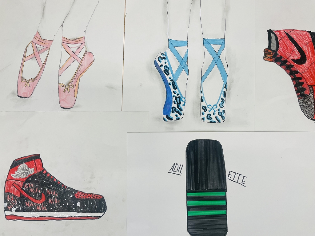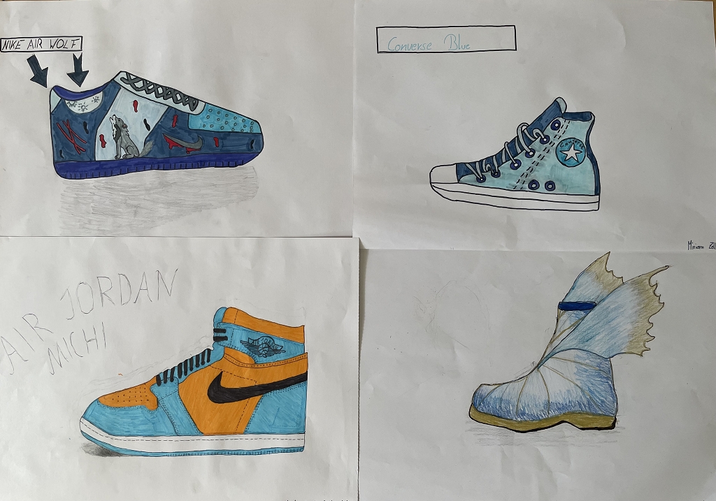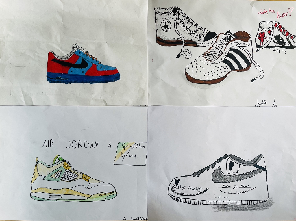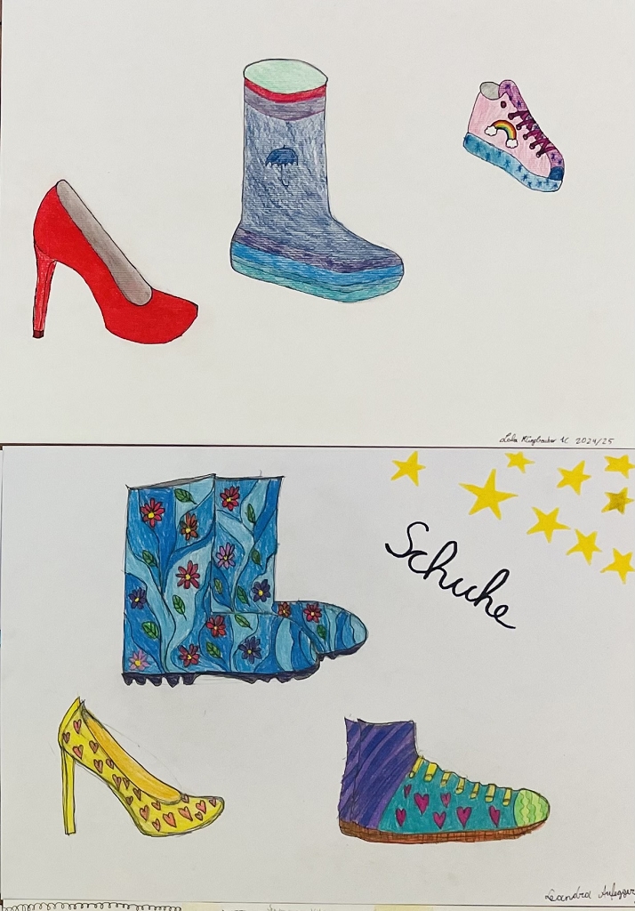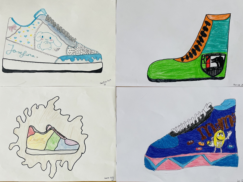 Daher griffen unsere Schüler: innen zu Farben und Stiften, um ihre Traumschuhe zu kreieren. Sie nahmen dazu entweder ihre eigenen Schuhe als Modell oder sie zeichneten ganz individuelle, fantasievolle Kreationen. Von bunten Badeschlappen und eleganten Ballett-Tanzschuhen über peppige Wanderschuhe bis hin zu extravaganten High Heels – es entstanden echte Unikate. Ob klobig und auffällig oder minimalistisch und clean – Sneaker waren die beliebtesten Motive.