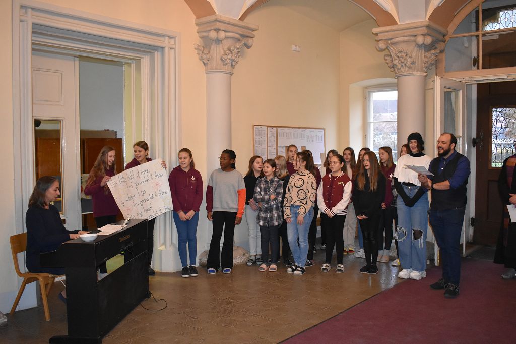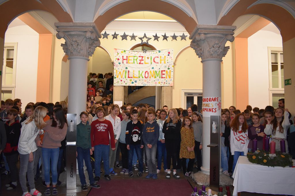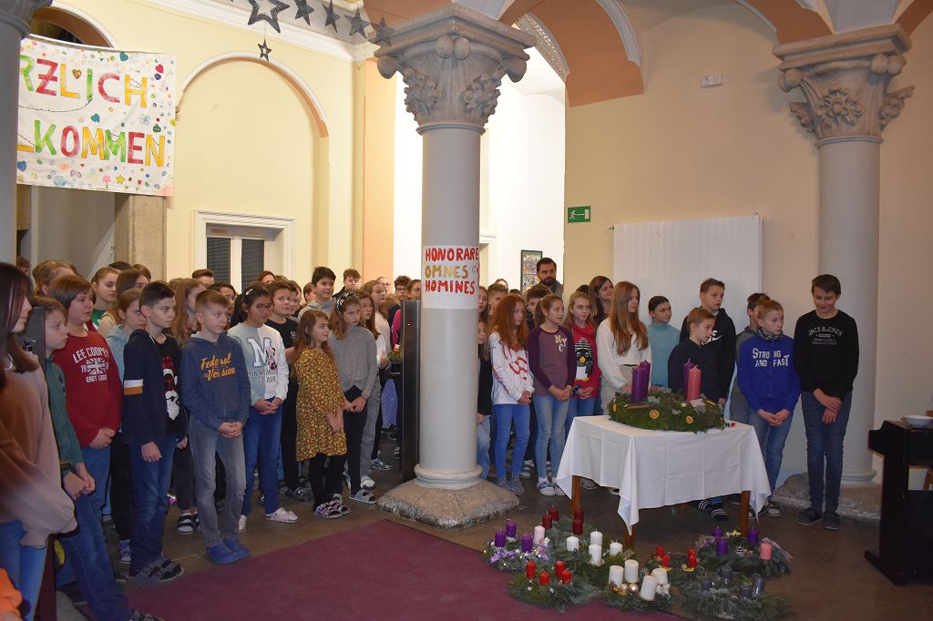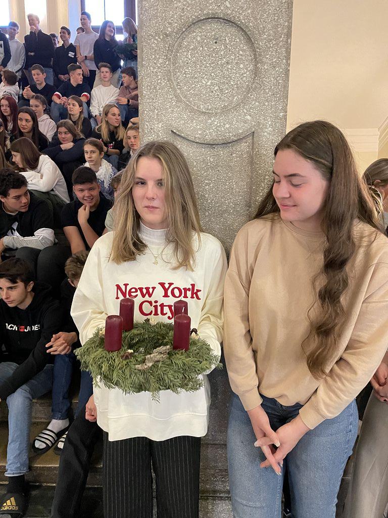 Stiftsadministrator Mag. Pater Marian Kollmann OSB und Frater Romanus Kriebernegg OSB aus dem Konvent leiteten mit andächtigen Worten den Advent und somit die Ankunft Christi ein. Die Gedanken der Nächstenliebe und des Friedens sollen uns in dieser Zeit begleiten, aber auch während des restlichen Jahres gelebt werden. Die Zeremonien im Konvikt und Gymnasium wurden vom Schulchor unter der Leitung von Mag. Almut Wakonig-Dalton und Thomas Zdravja stimmungsvoll umrahmt. Nach der Lesung und den Fürbitten, die von den Schülerinnen und Schülern vorgetragen wurden, erfolgte die Segnung der Kränze und das Entzünden der ersten Kerze.