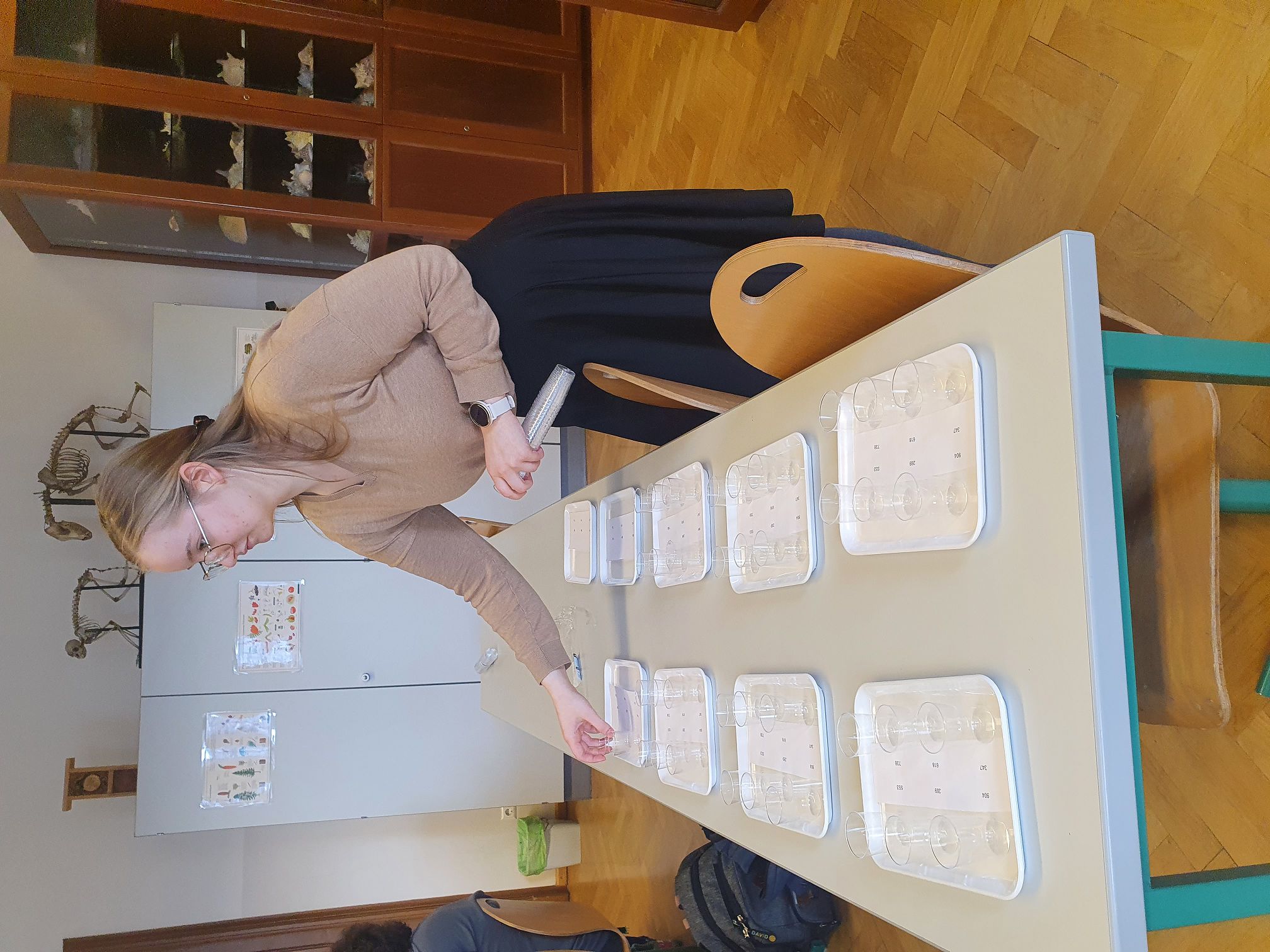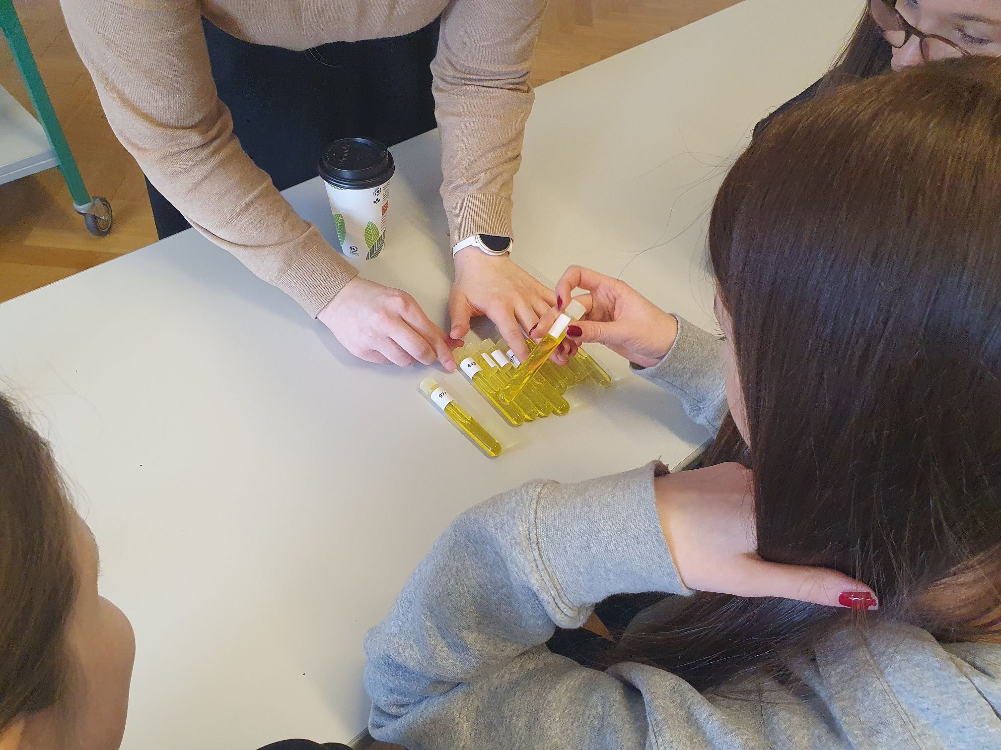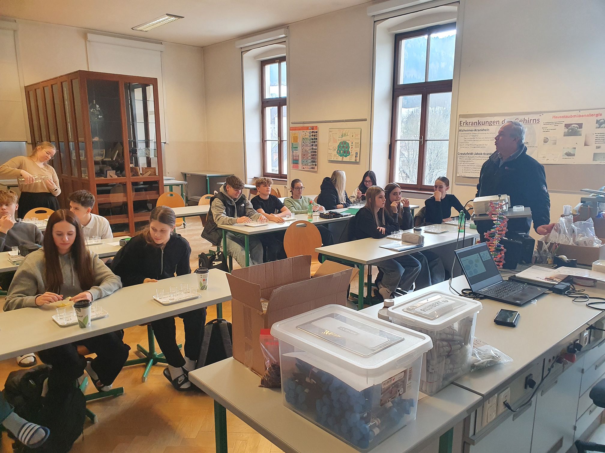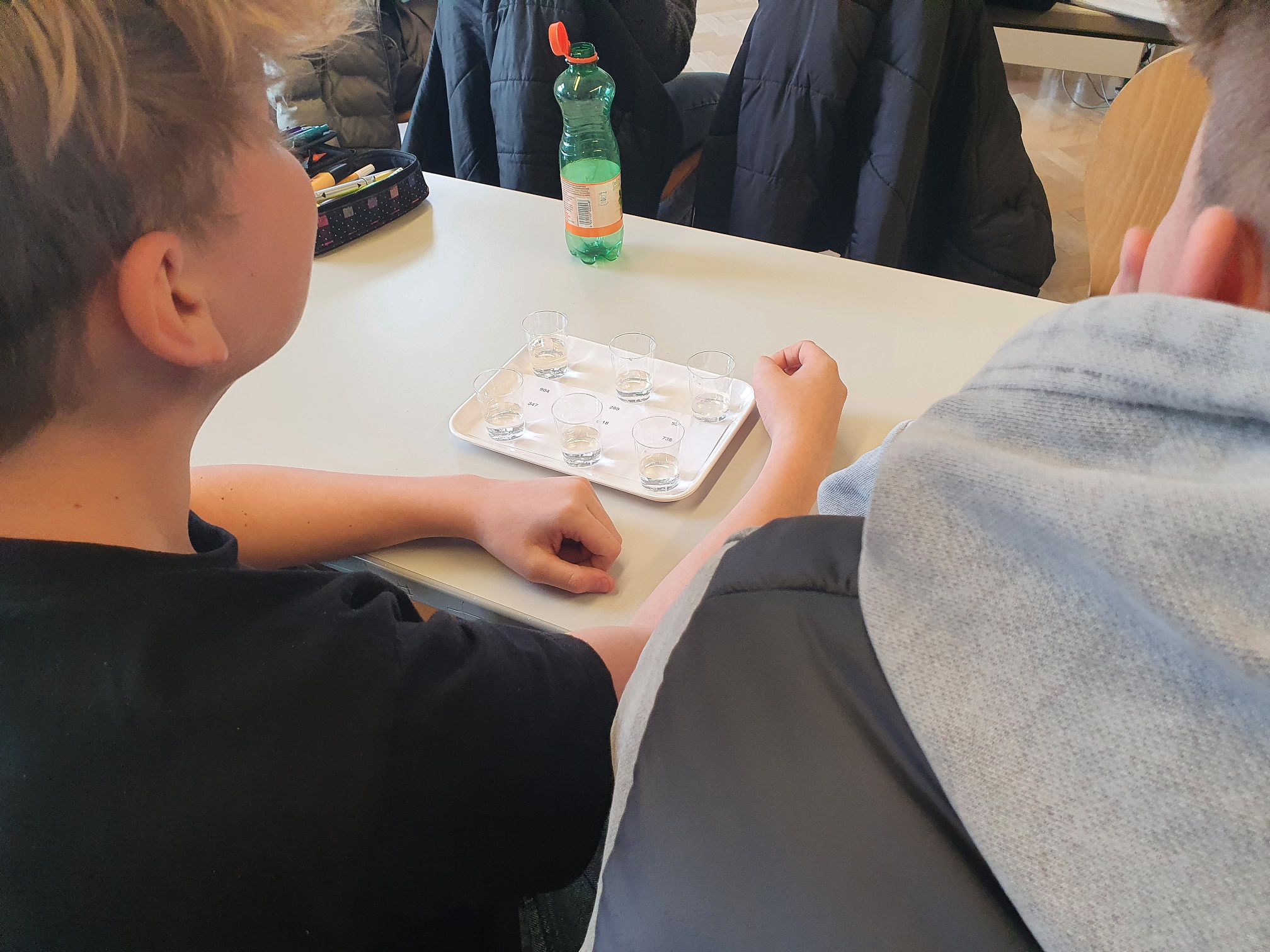 Zuerst wurden wir ausführlich in das Thema Sensorik eingeführt, bevor wir danach einige Versuche durchführen konnten. Zum Beispiel mussten wir Flüssigkeiten nach den verschiedenen Helligkeiten erkennen oder durch Schmecken herausfinden, ob die Flüssigkeitsproben süß, salzig, bitter, sauer oder nach umami schmeckten. Wir bekamen auch den Wirkstoff einer Schlingpflanze auf unsere Zunge, welcher es den Papillen unserer Zunge unmöglich machte, über einen kurzen Zeitraum süß zu schmecken. Nach der Einnahme mussten wir traurig feststellen, dass Nutella auch nach nichts schmecken kann. Außerdem durften wir Cola testen. Zwei davon schmeckten gleich und bei der dritten handelte es sich um Cola Zero, was es ohne unser vorheriges Wissen zu unterscheiden galt.