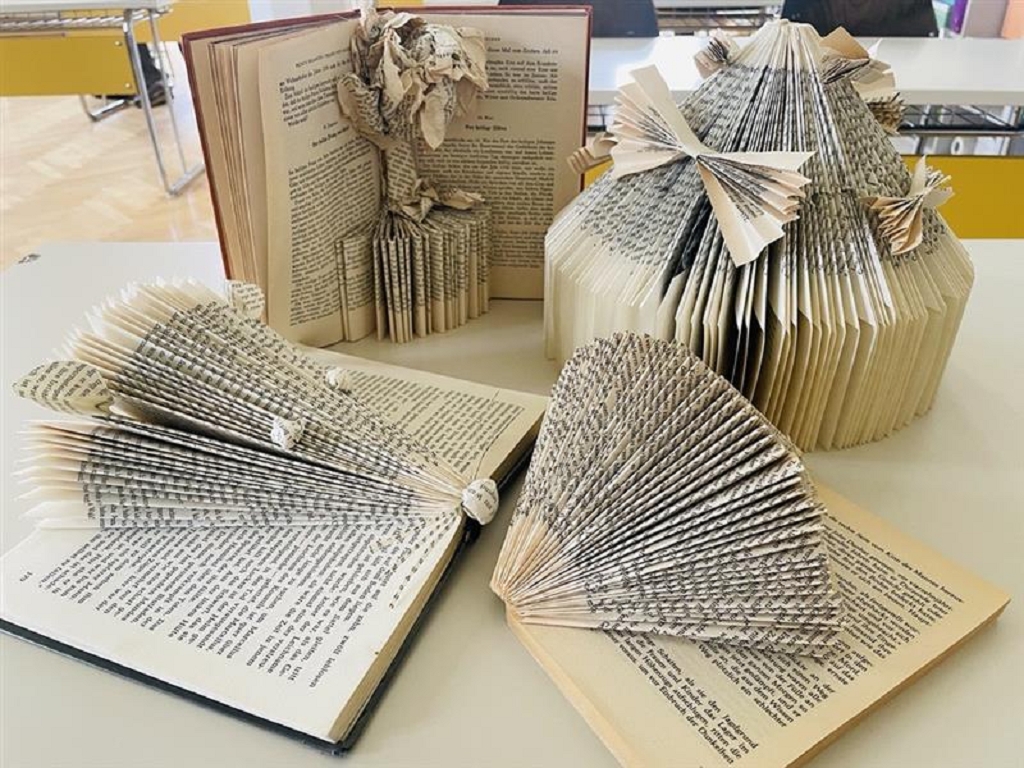 Die Schüler:innen der 7. Klassen des Stiftsgymnasiums verwandelten alte Bücher in Kunstwerke.