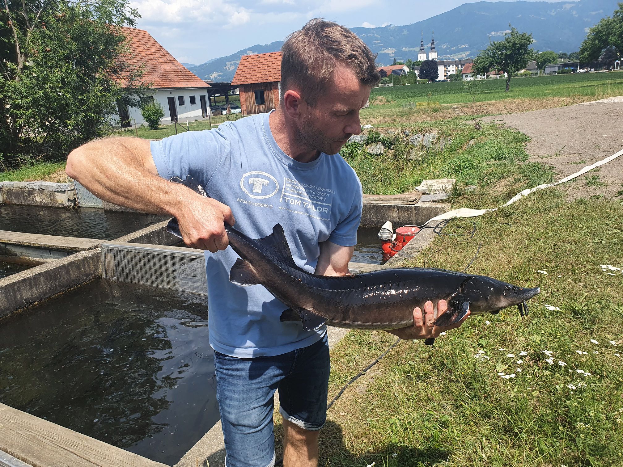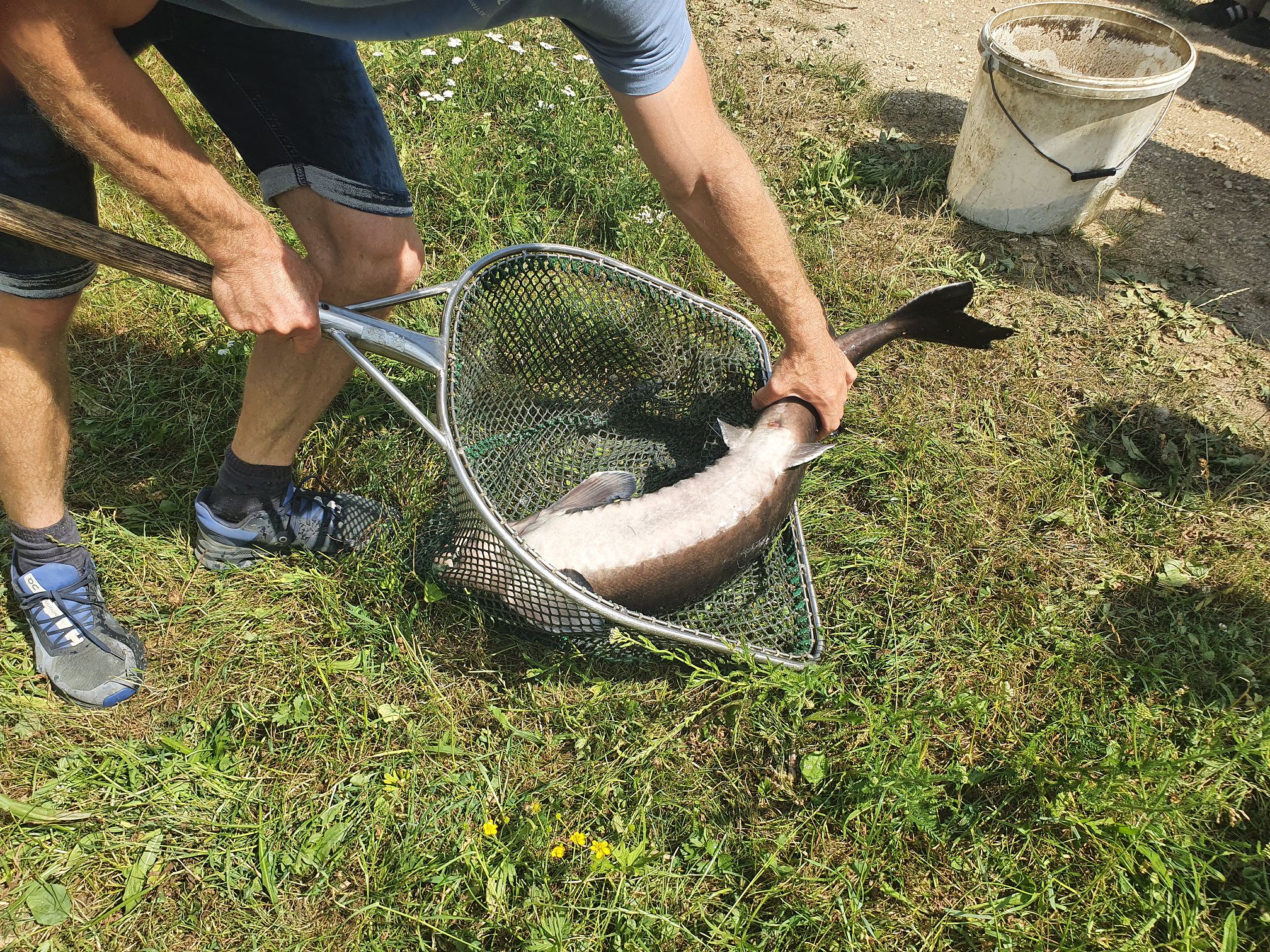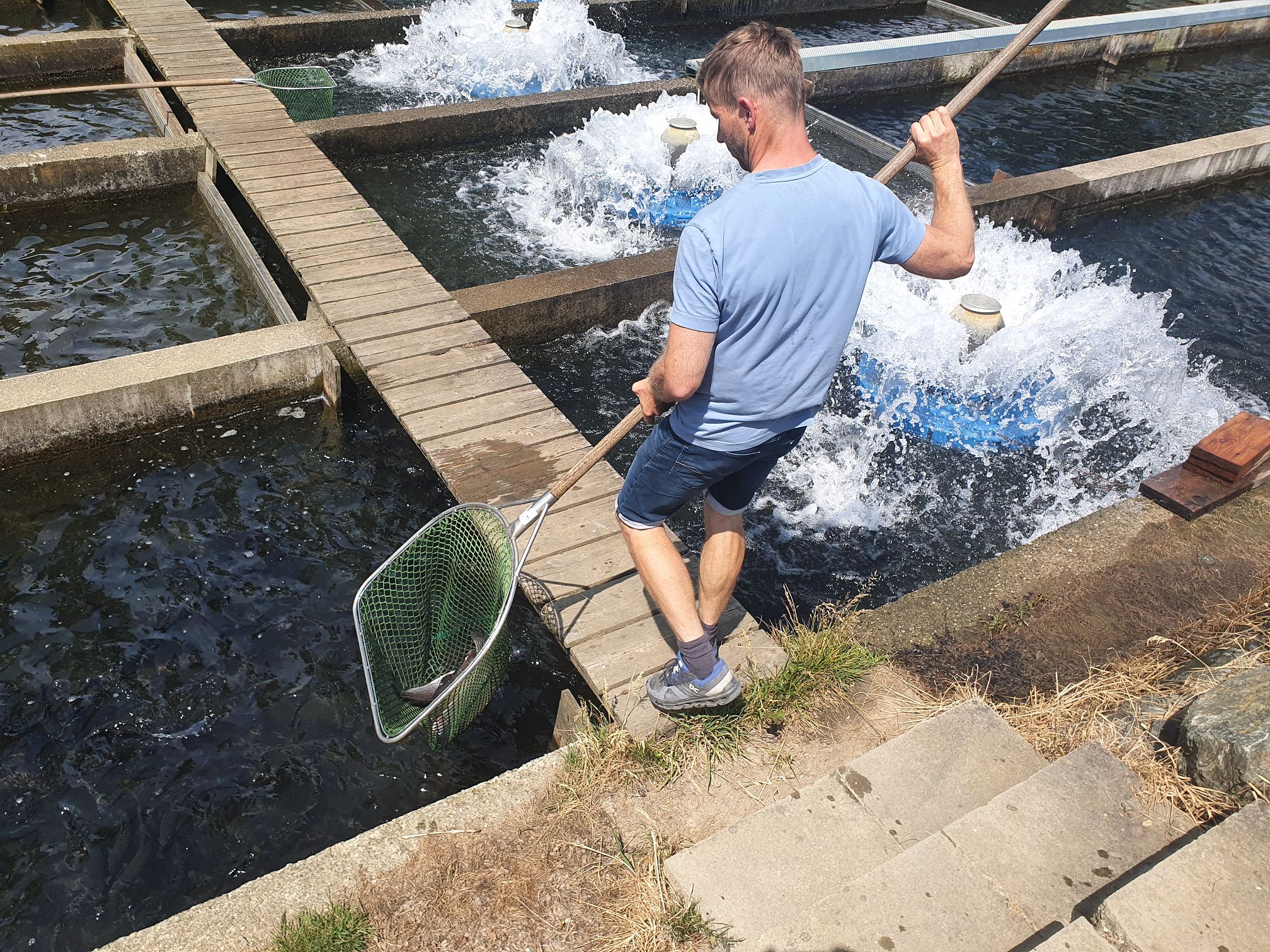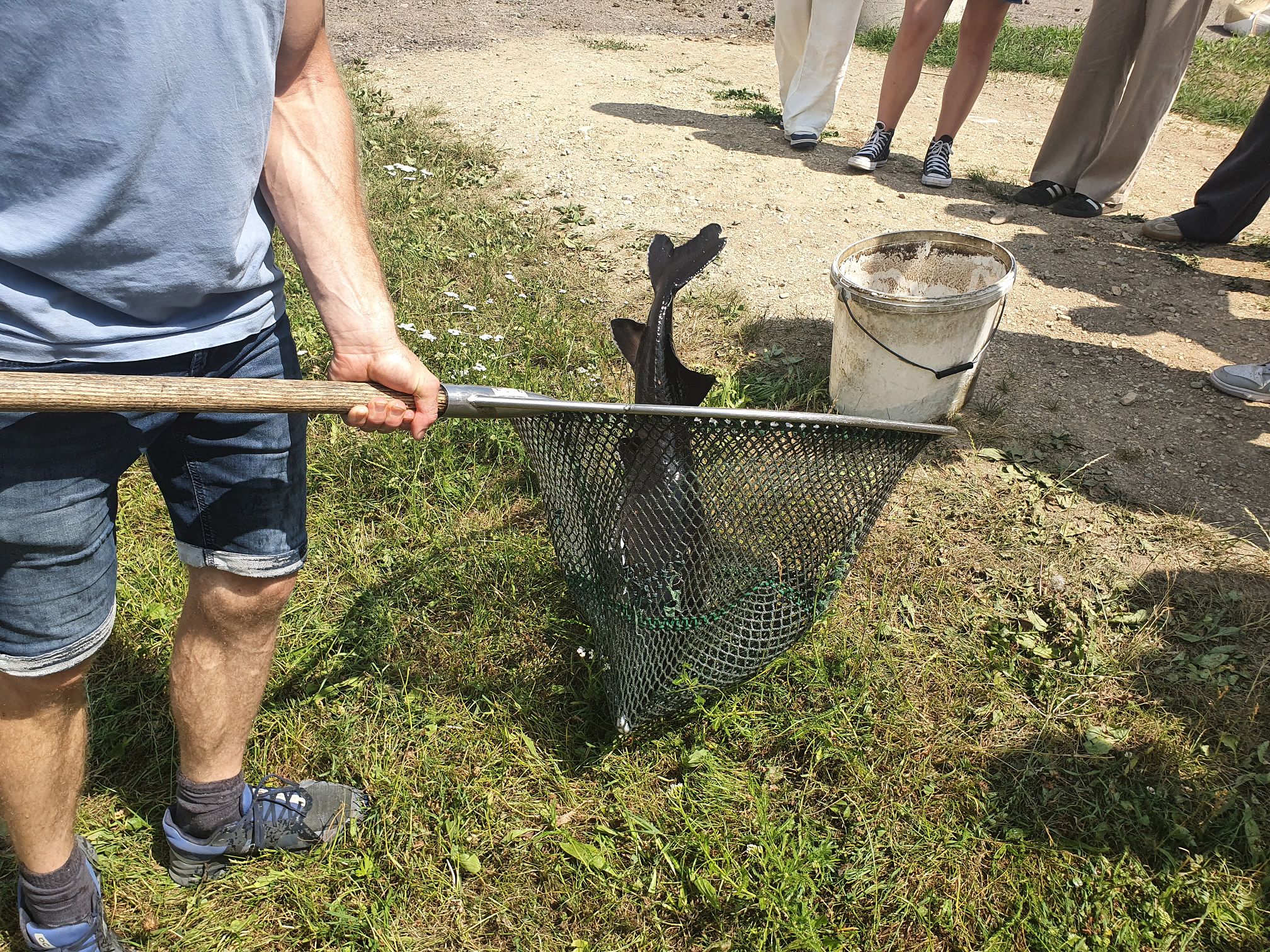 Im Rahmen der Führung wurde uns eine der drei weitläufigen Teichanlagen gezeigt und die naturnahe, extensive Aufzucht ausführlich erklärt: Im Mittelpunkt stehen sauberes Wasser, artgerechte Haltung und nachhaltige Methoden. Wir durften live beim Füttern zusehen und erfuhren, wie hoch der technische Aufwand hinter der Fischzucht ist.