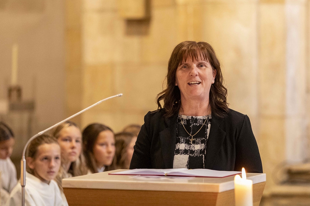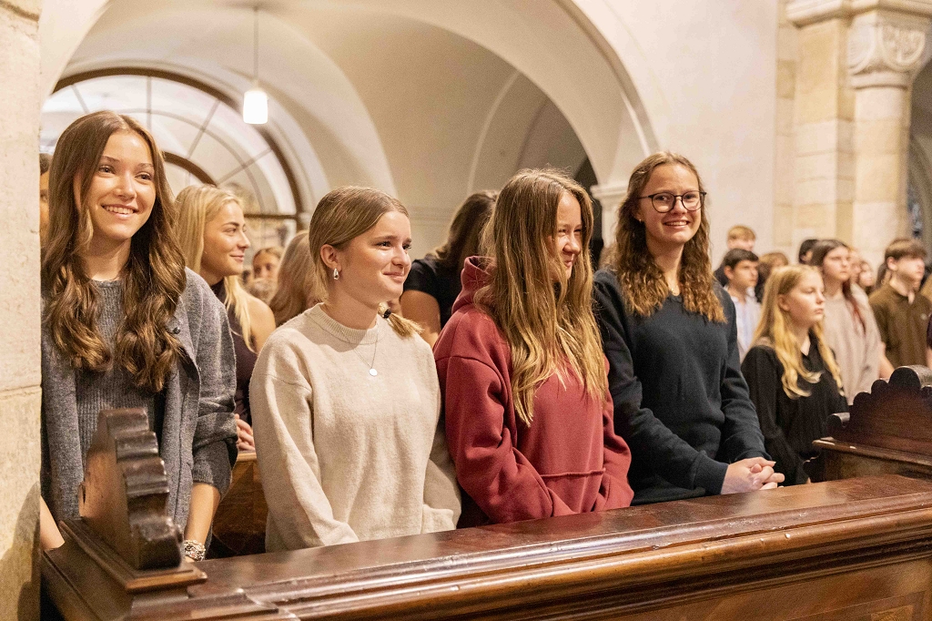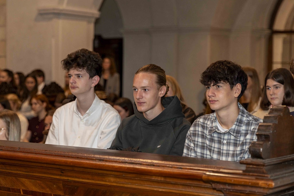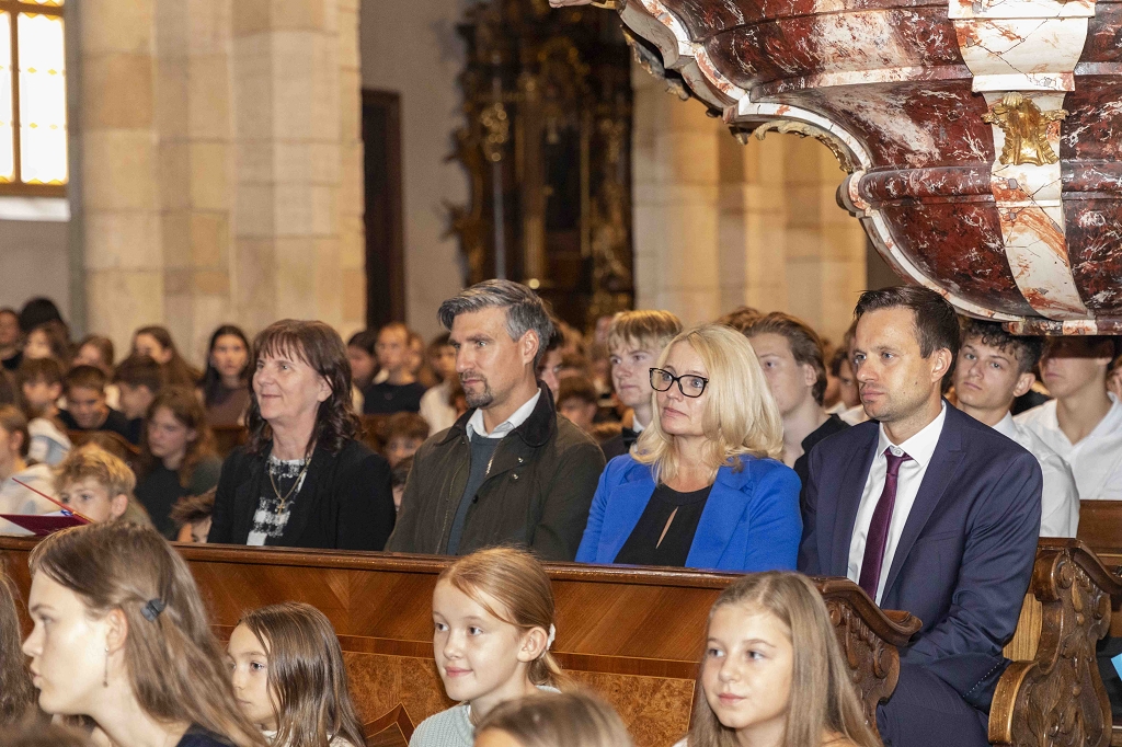 Direktorin Prof. Ines Leschirnig-Reichel lud in ihrer Schlussansprache zu einem guten und konstruktiven Zusammenarbeiten ein und dankte allen für ihr Engagement. Im Anschluss an den Gottesdienst traten die achten Klassen zu einem gemeinsamen Foto im Festsaal des Konvikts an.