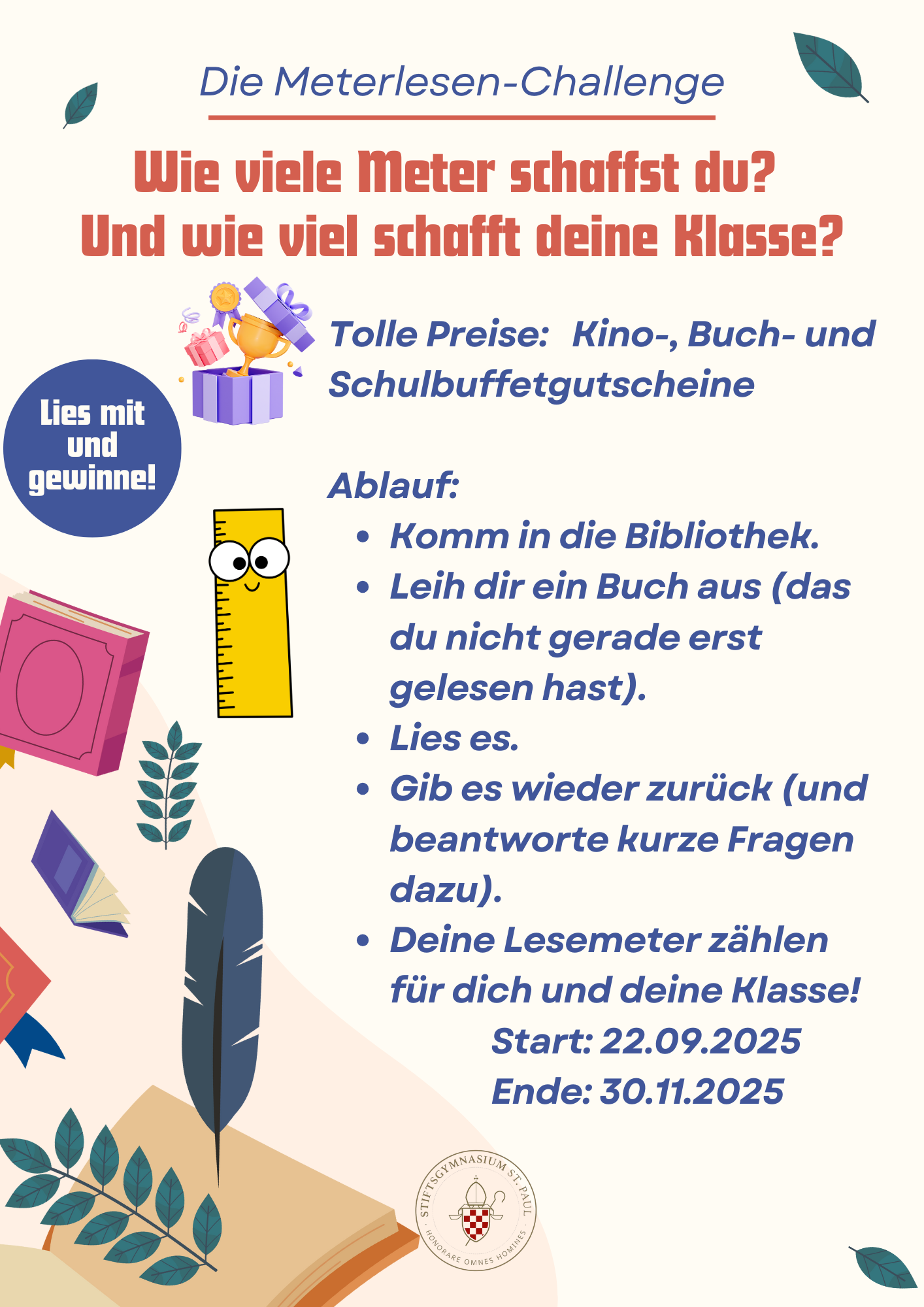 Ab 22. September 2025 geht es los: Unsere Bibliothek lädt alle Schüler:innen der Unterstufe zur Meterlesen-Challenge ein. Gemeinsam wollen wir herausfinden: Wie viele Lesemeter schaffst du? Und wie viel schafft deine Klasse?